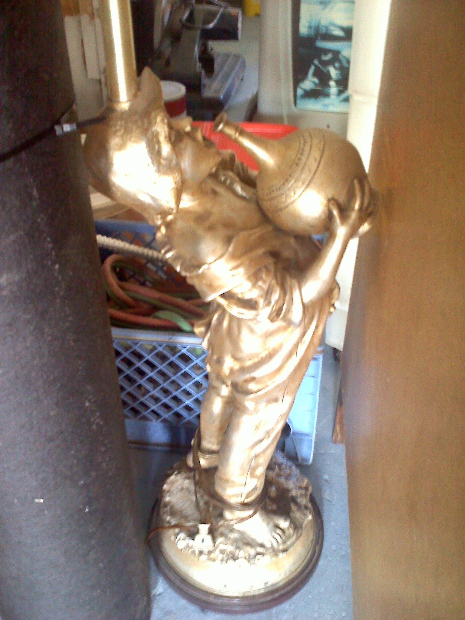 Ornate and highly decorative lamp sculpture of a young boy drinking, painted in gold leaf, signed Marbro Lamp Co., circa 1950's
