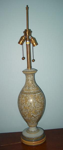 Superb high quality workmanship. Beautifully handmade and painted ceramic lamp with original parts, shade and electronics. THe Marbro tag has the number 6745 stamped on it to authenticate it and I knew this was a collectors item when I found it an purchased it twn years ago. It is excellent condition and in working order, though it does need brass to be cleaned and polished and tightenning of the sockets. The base is made of wood and painted. This needs to be touched up; however, I know that it is better to allow the buyer and collector to purchase it as is. Otherwise, it is mint...