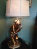 The lamp is a statue of a lady, barefoot, sitting on a stump, right fingers touching her chin.