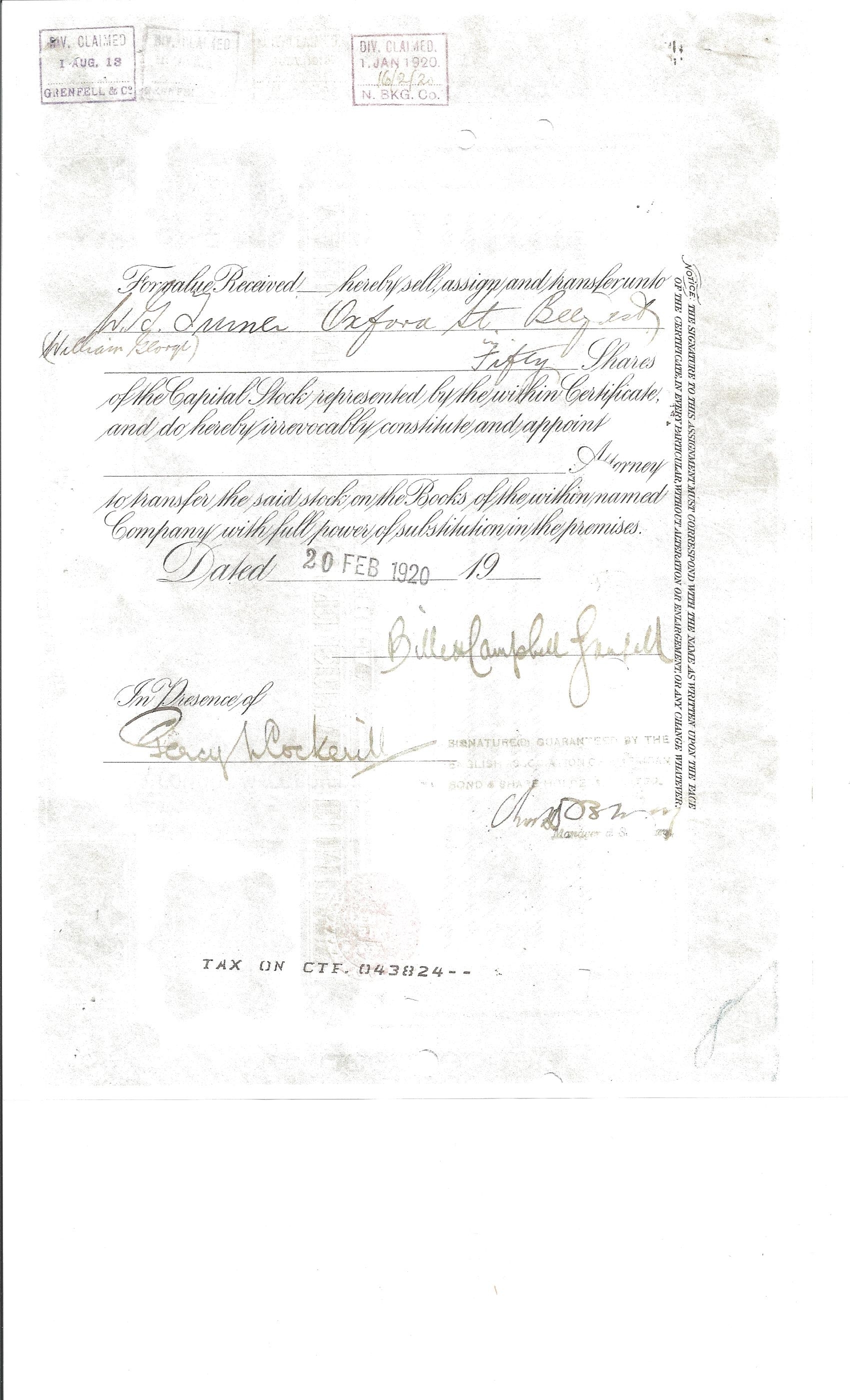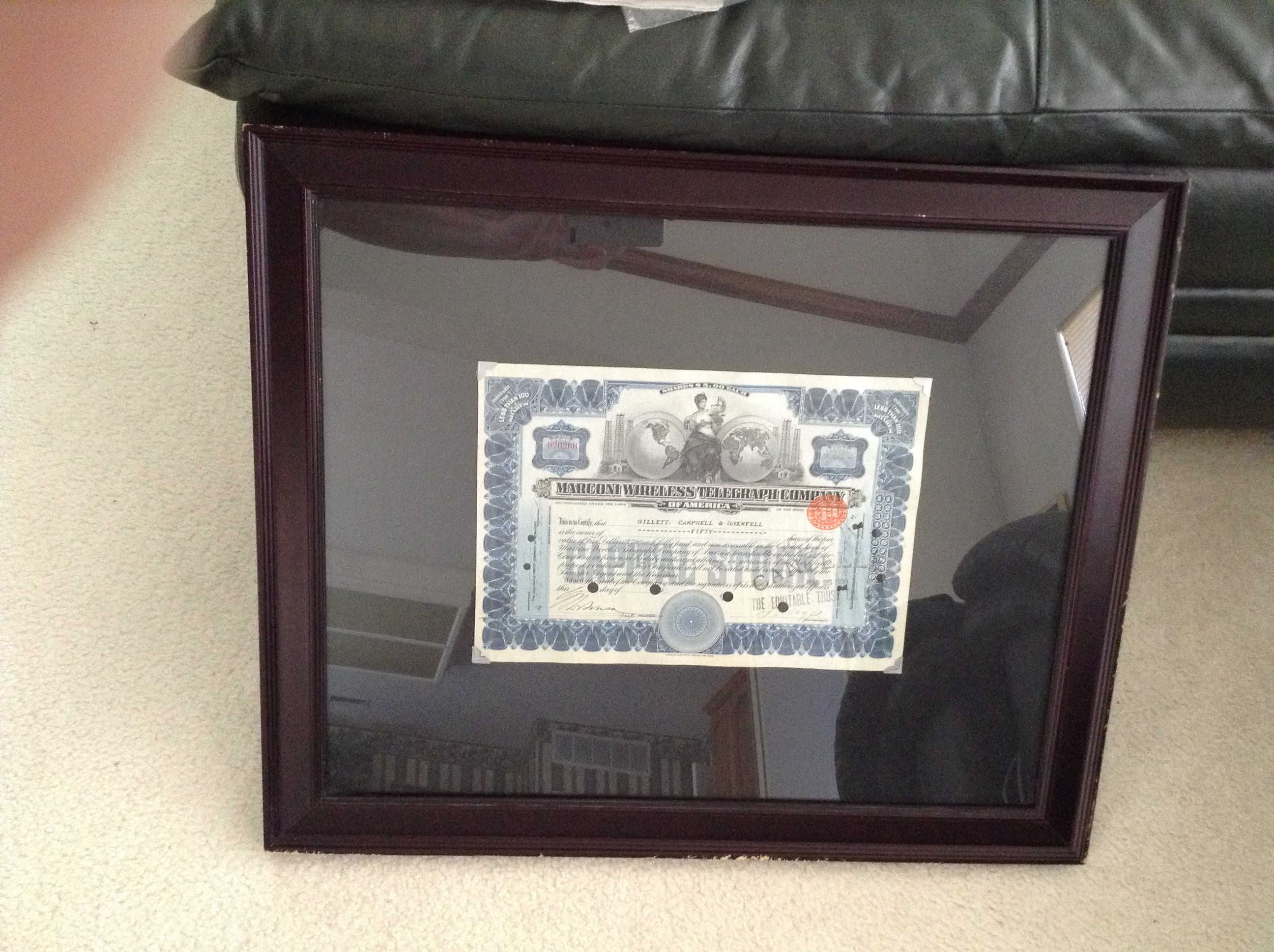Hello Everyone, I have a Marconi Wireless Telegraph Company of America stock certificate. The scans of the front and back are included along with of picture of it in its frame. It appears to have been purchased in 1913 by the broker Billet, Campbell, and Grenfell. In 1920 it was bought by a man of the name William George Turner whose signature is on the back with Oxford,St Belfast next to it. About a month after he purchased it, the stock certificate was cancelled due to the absorption of Marconi into the new formed company RCA (I believe that's why there are a bunch of punch holes throughout the certificate). I did some research and found out he was the Lord Mayor of Belfast, Ireland from 1923-1928 and was Knighted by the Royal Crown in 1924. I also found out he had an interest in wireless communication and was mayor of Belfast during the broadcasting boom throughout Belfast and Britain during the mid 1920s. Also of note, he was fundamental to the formation of the Belvoir Park Golf Club in Belfast. I researched the price of these Marconi of America stock stock certificates without any historically significant signatures and they seem to range from $50 to $100. How much do you think the presence of the Mayor's signature will increase the value? Overall, I am happy with my find and have enjoyed researching the history behind it. Thanks for the input.