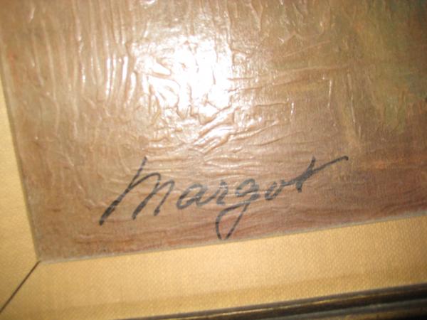 I found this picture hanging in my house when we moved in 20yrs ago. It is framed in 1971 and it looks like acrylic It is signed by the artist Margot. It is in perfect shape, other then that dont know anything else about it