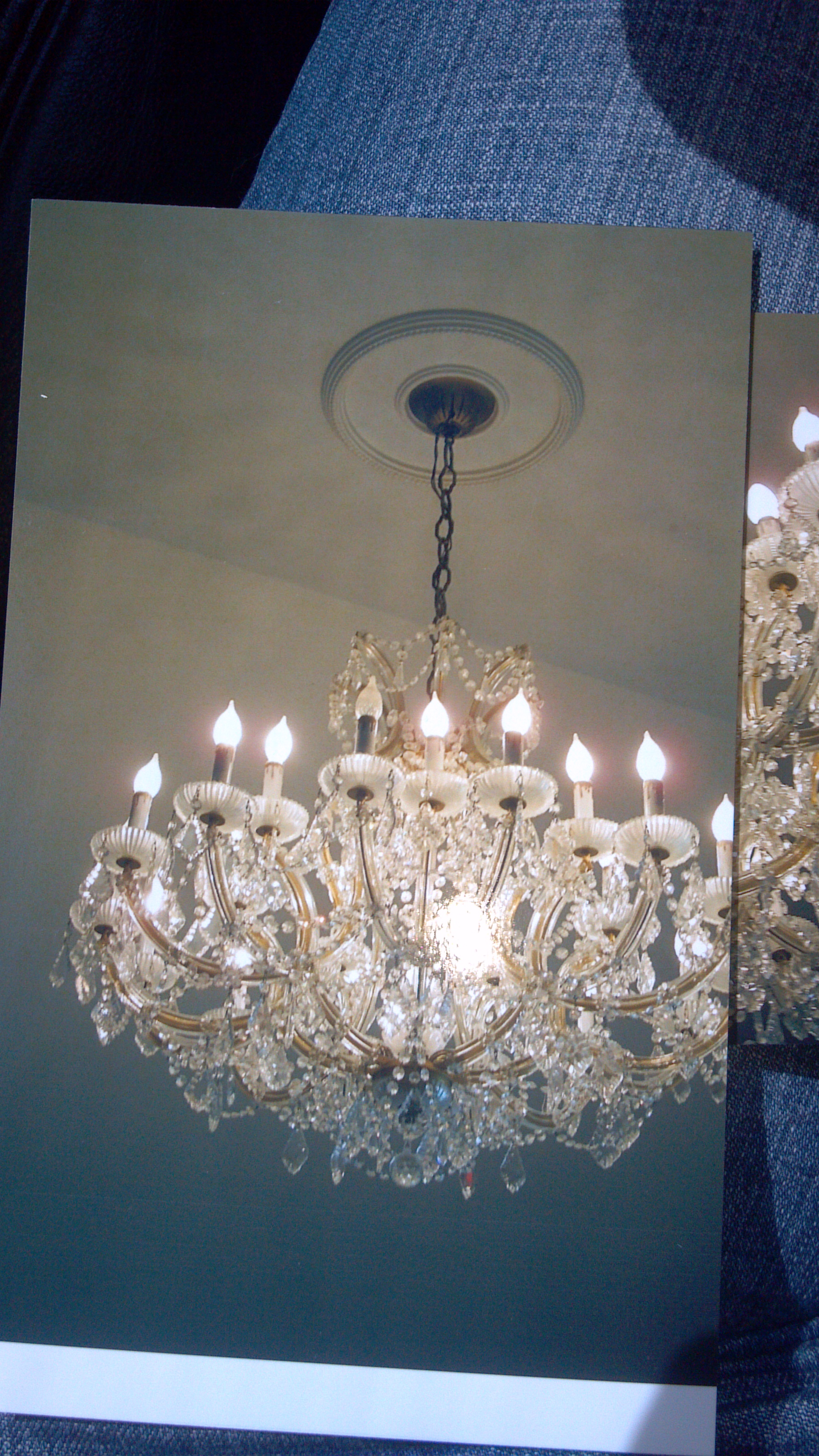 The chandelier is about 3money ft wide, 2 ft yall. Vinyl over the gold colored arms. All crystal is good, none missing. Original wiring but it works. Not sure of origin???