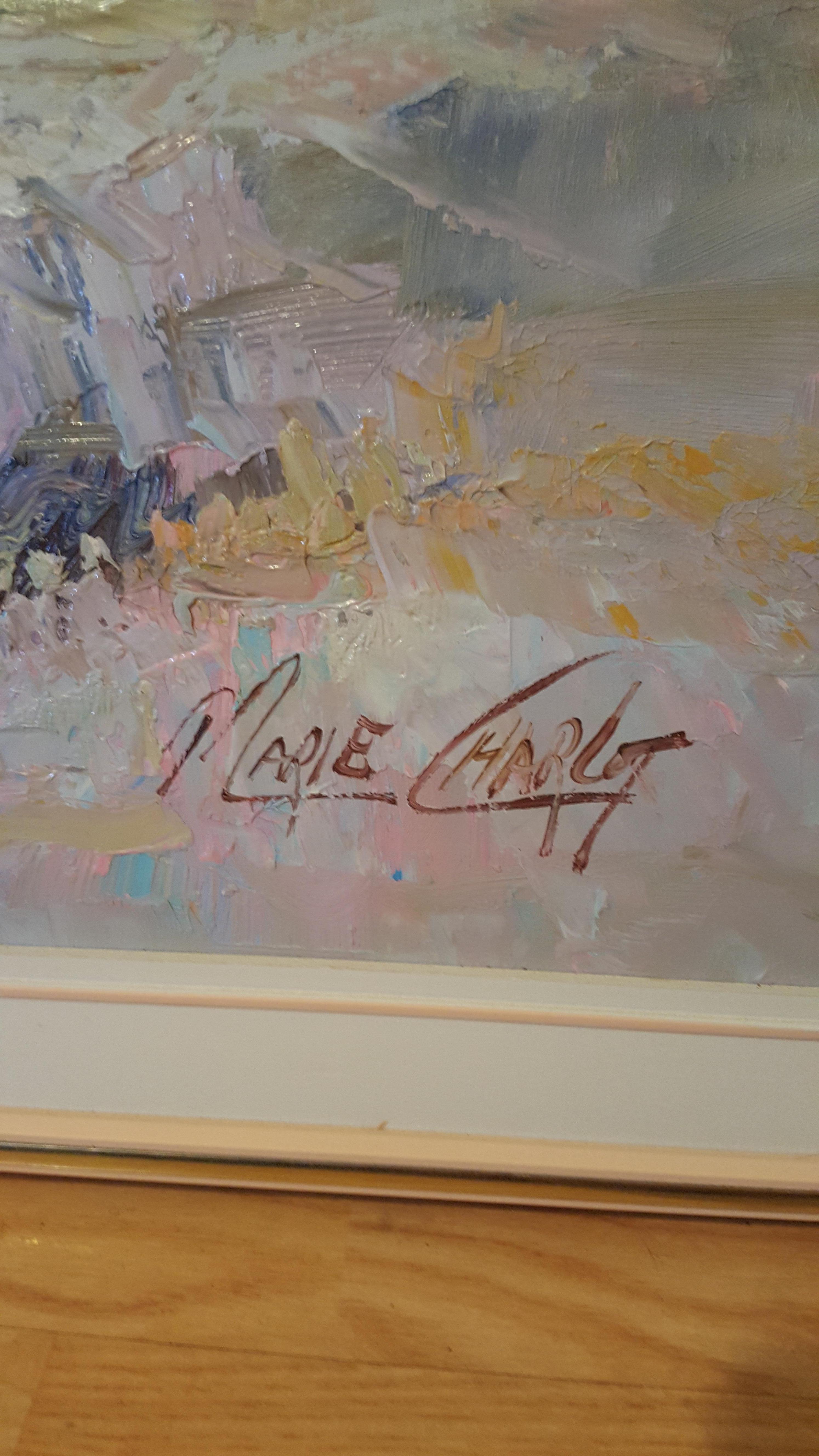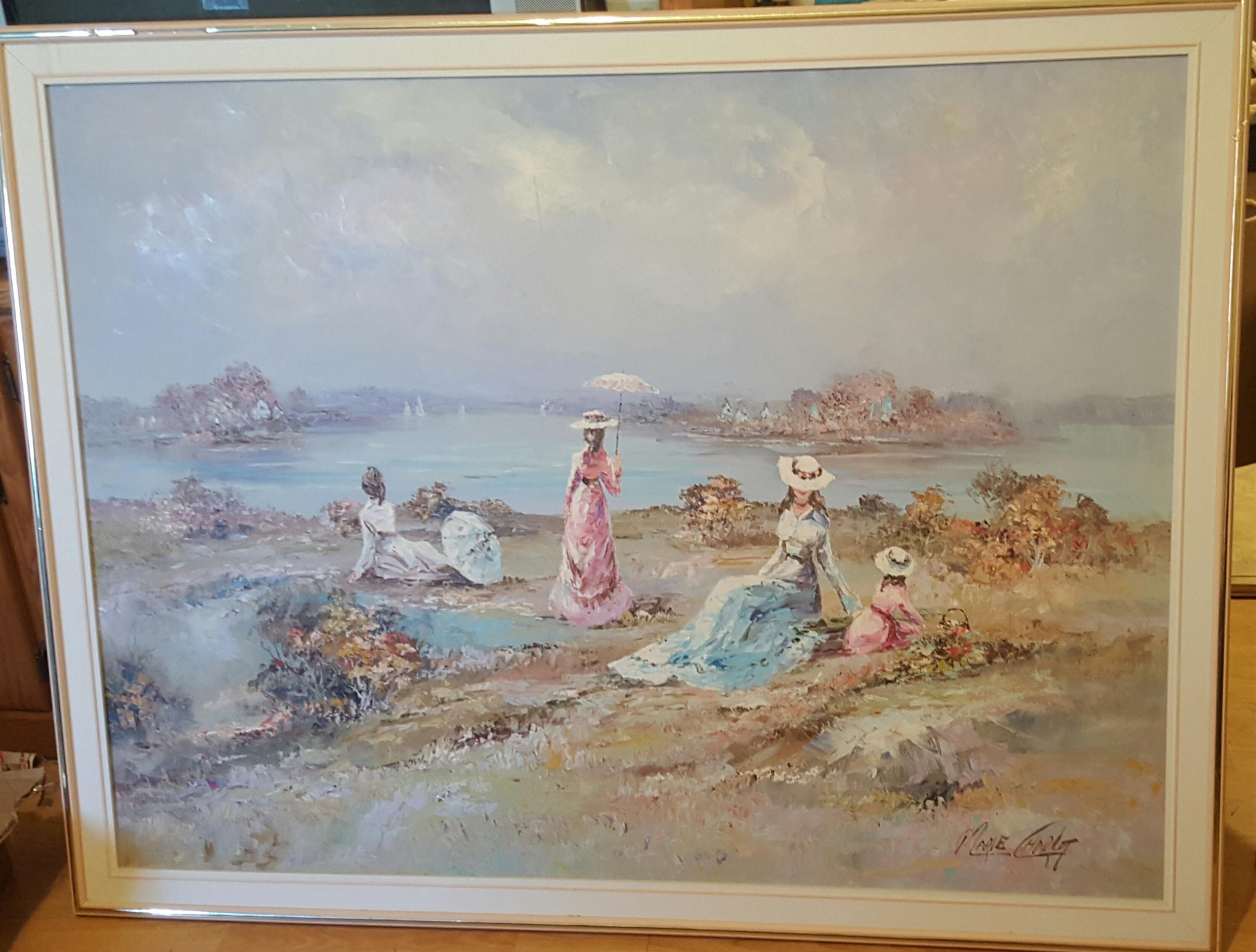 This is an oil painting by Marie Charlot measuring 4ft x 3ft Beautiful scene of some women and children enjoying their time beach front. It is in perfect condition. I received it by purchase of an estate sale.