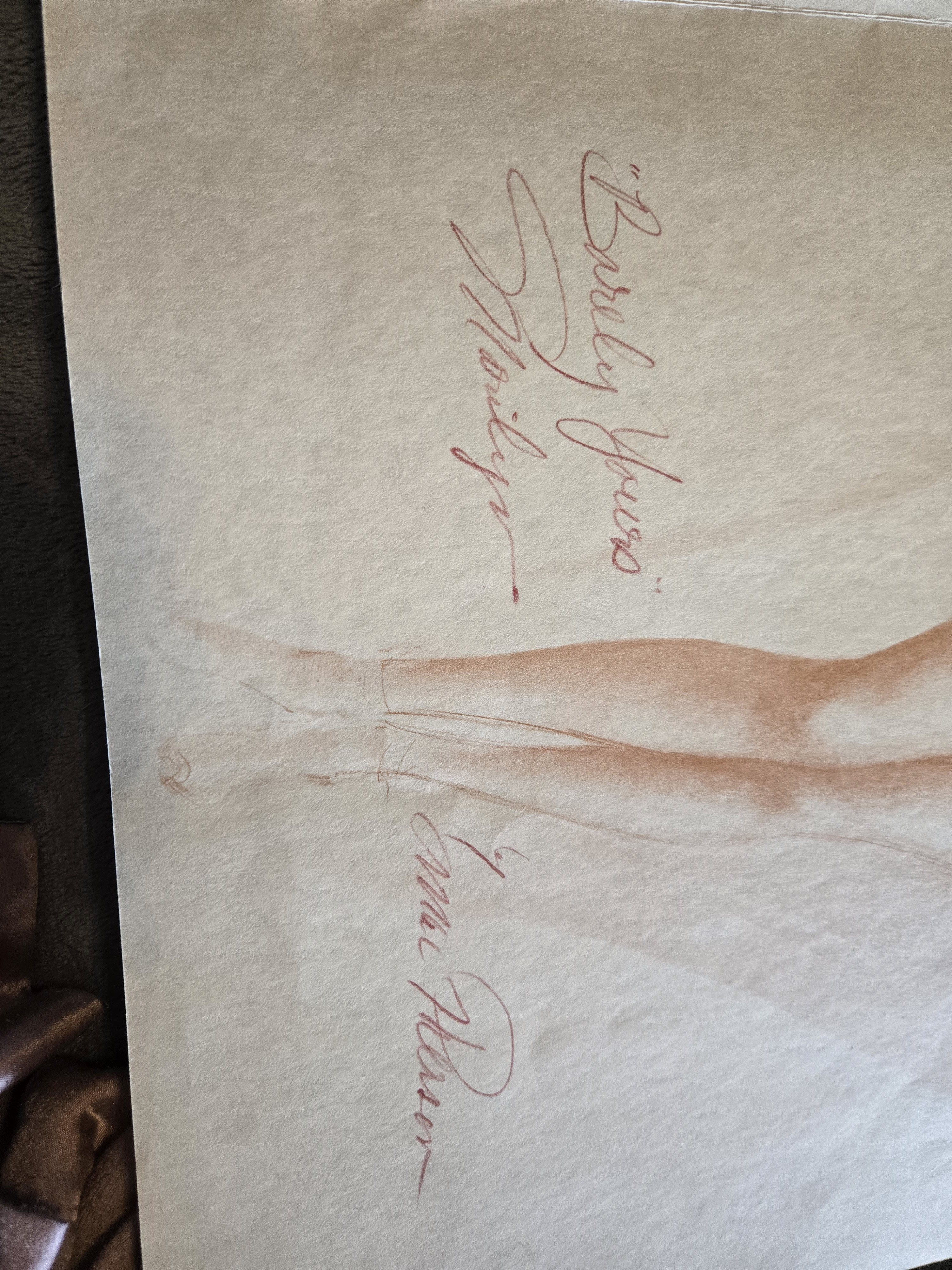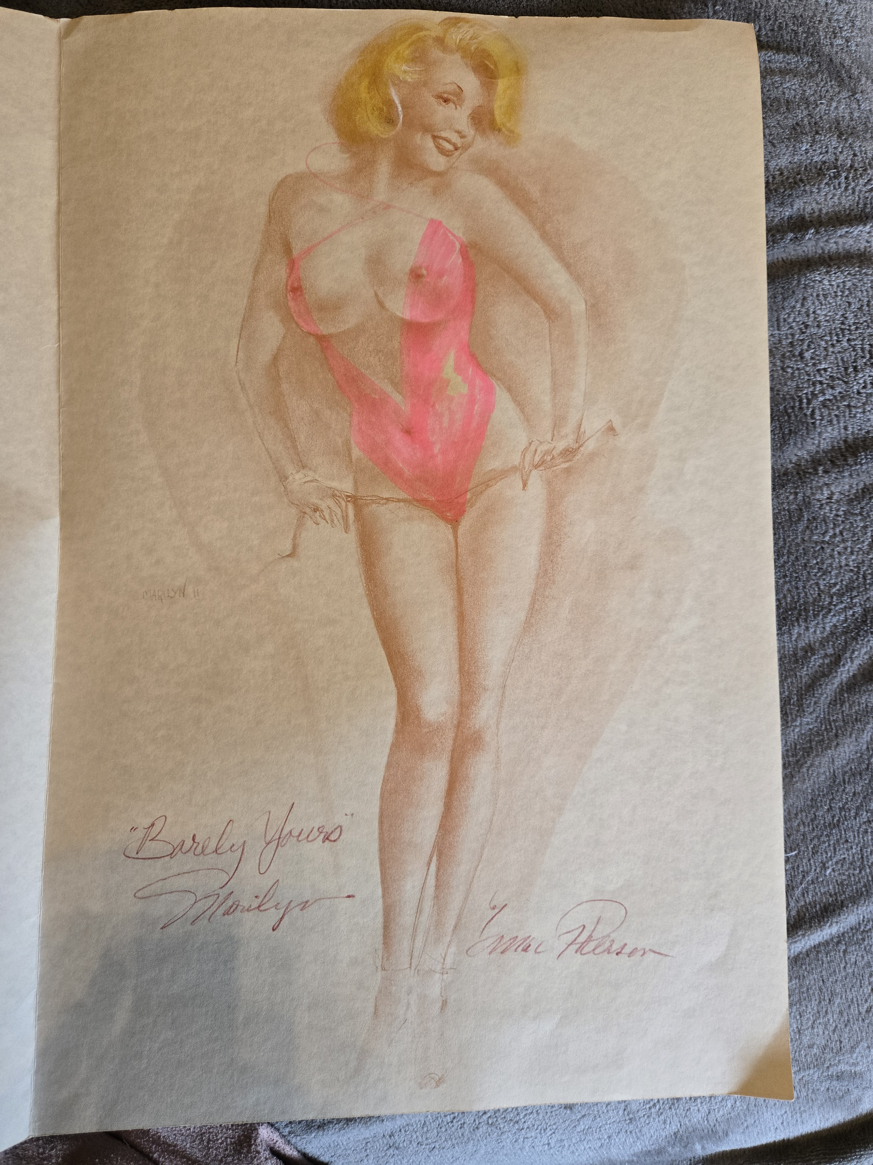 Physical Description: This piece is a limited edition print featuring a stylized depiction of Marilyn Monroe, titled "Barely Yours, Marilyn." The artwork is rendered in soft colors, primarily featuring a pink swimsuit. The print is signed by the artist, Earl Mac Pherson, and is printed on high-quality suede paper, which is known for its durability. The dimensions of the print are not specified, but it appears to be a standard size for art prints, likely around 18" x 24". The print is part of a limited edition, with fewer than 1,000 copies available.