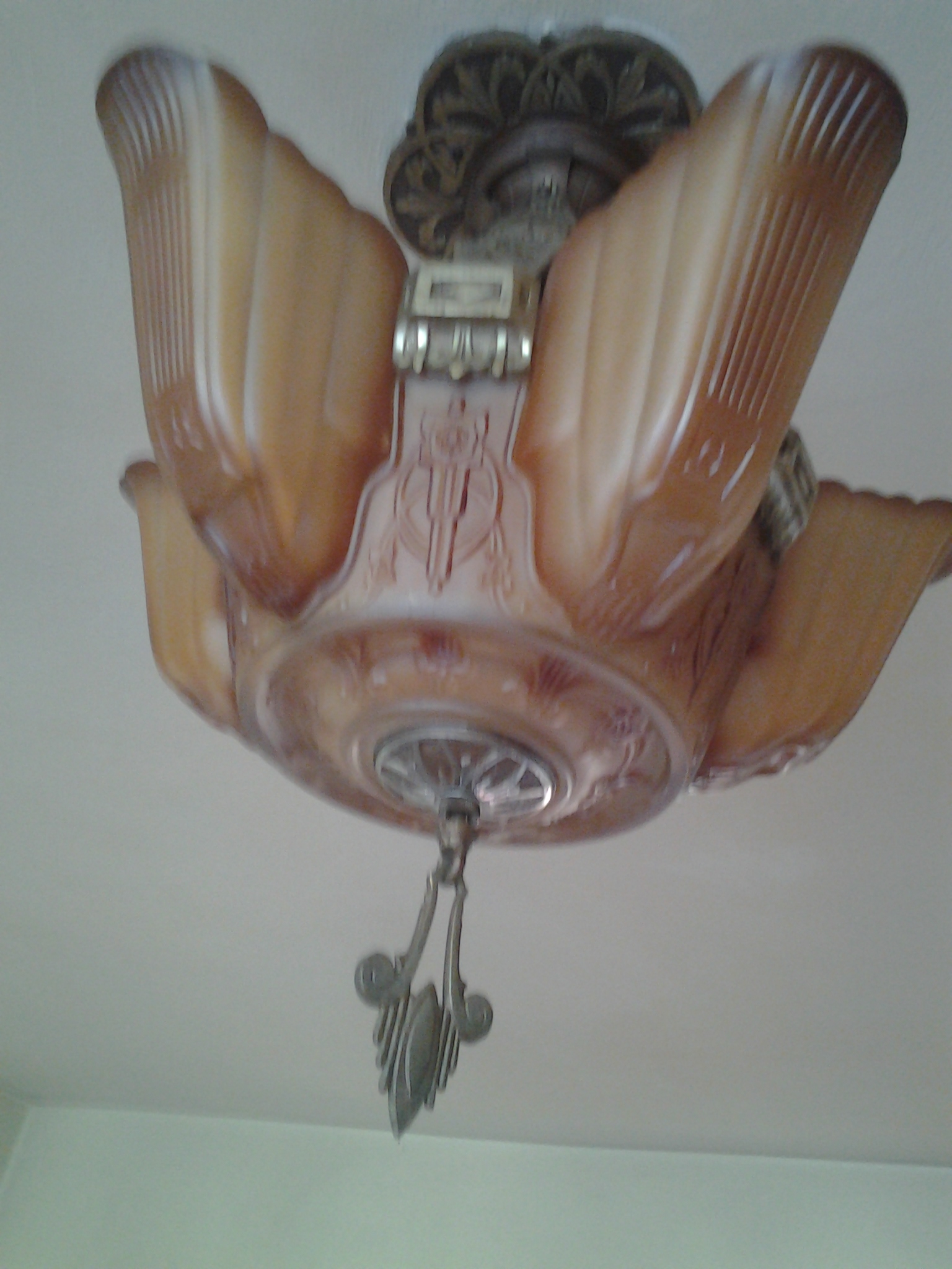Antique Glass Chandelier. It has a multi-settings for lighting. The switch hanging below the chandelier controls the setting. (see pic) The 4 sections can easily be removed.  Manuf. 1930-40
