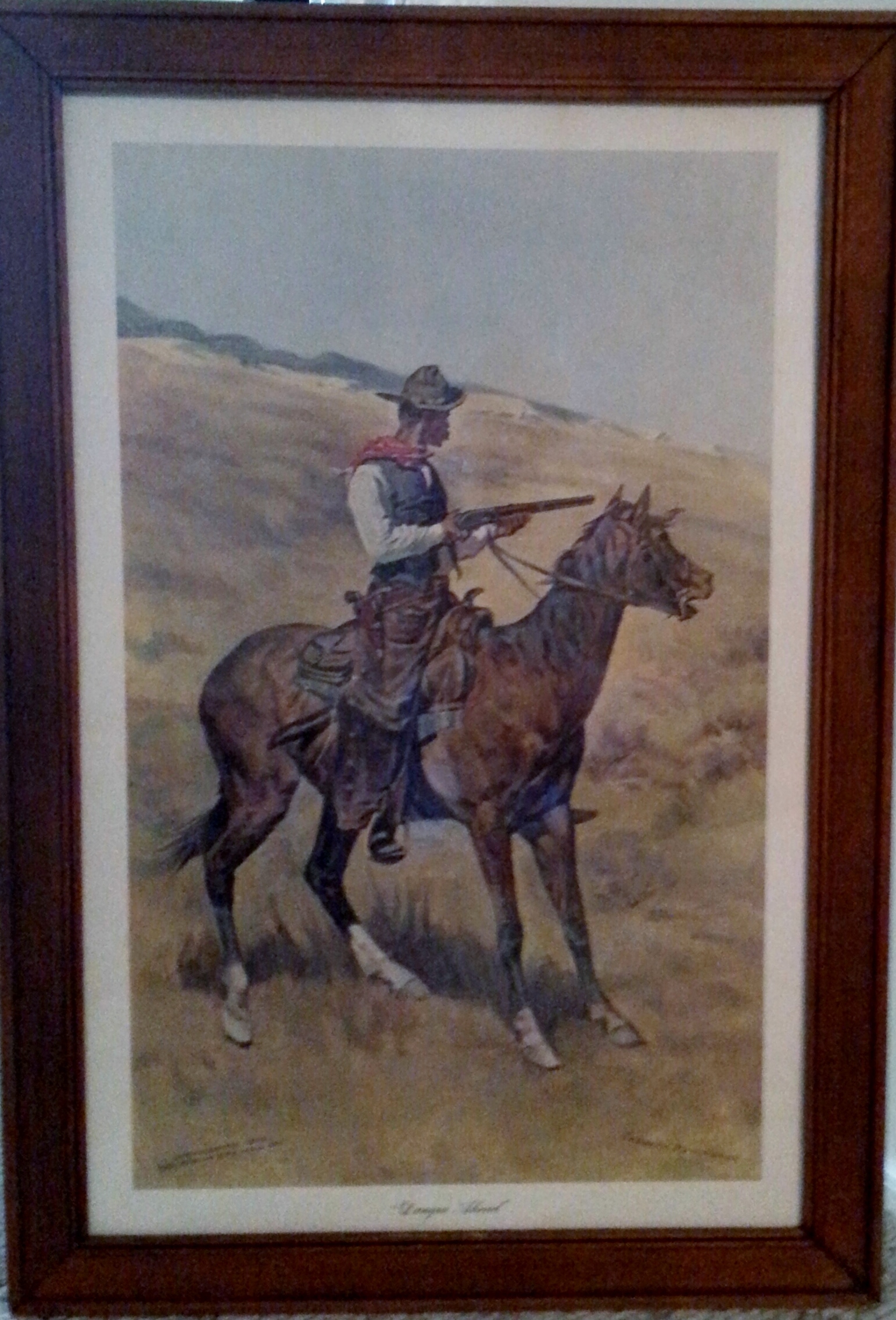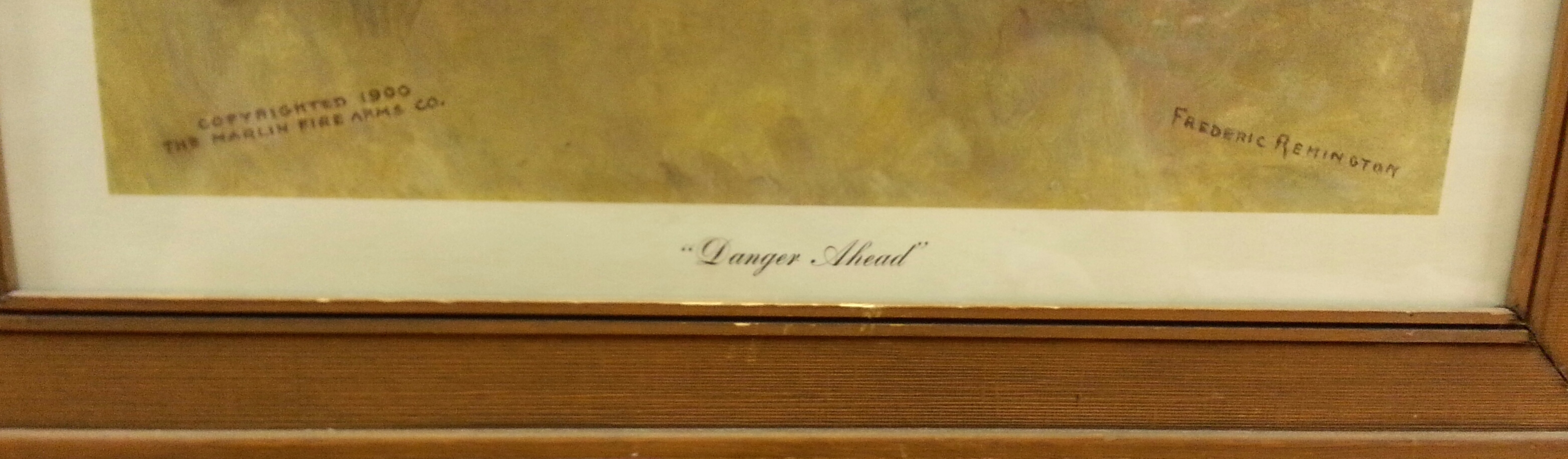 Marlin Fire Arms paper sign entitled "Danger Ahead". Frederic Remington artist. Copyright 1900. Framed underglass. 19 X 29 inches image only.