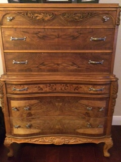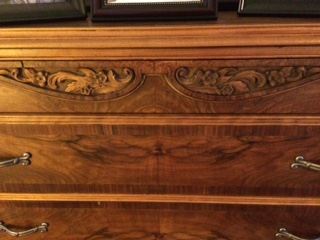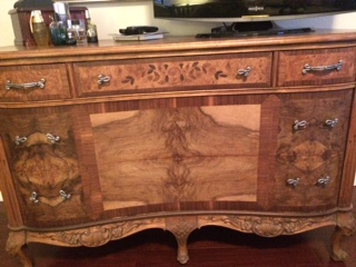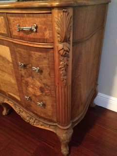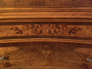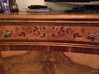 I bougt the 2 pieces at a garage sale. They were painted white and we striped them to find the beautiful wood and inlay.