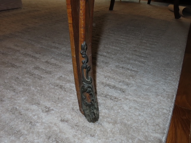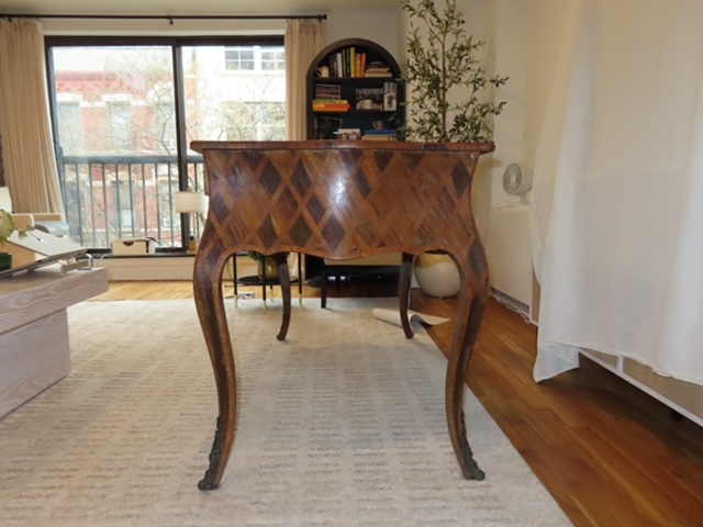 Marquetry Writing Desk. Dating to c. 1900-1950. Materials: Wood, inlay. Estimated value: $225 – $400. Condition: Fair. Moderate demand for antique writing desks; prices vary widely based on condition and craftsmanship.