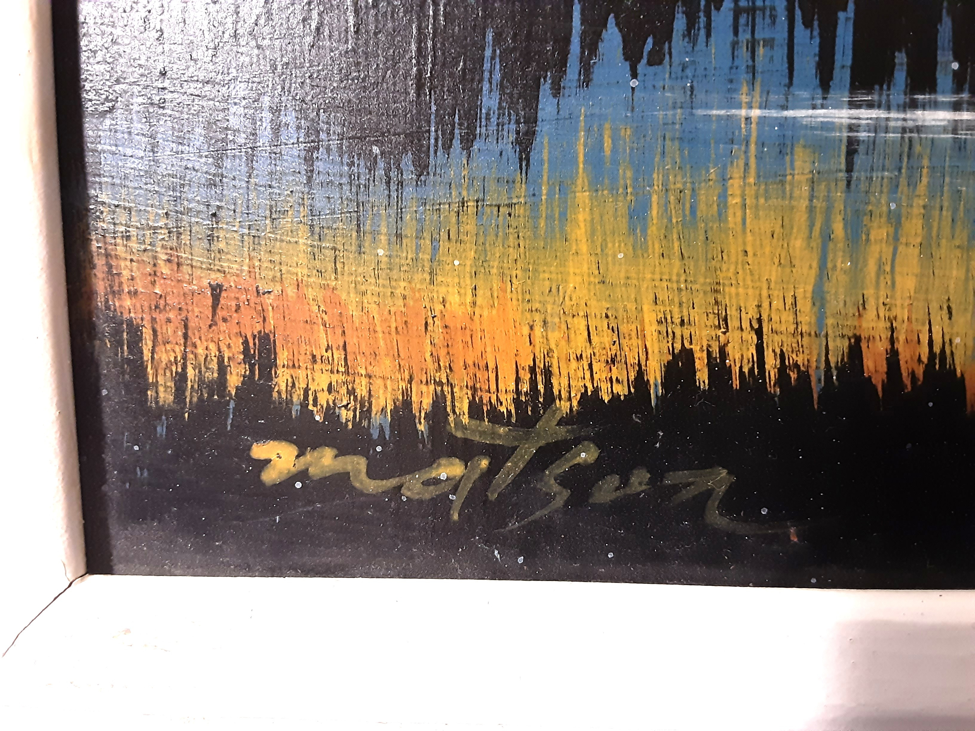 The signature matches known works by Richard Matson, a mid-20th-century American painter recognized for stylized landscapes, seascapes, and vibrant color palettes. While definitive attribution requires provenance or expert verification, the stylistic elements—particularly the brushwork, bold color fields, and scenic composition—are consistent with Matson’s work.