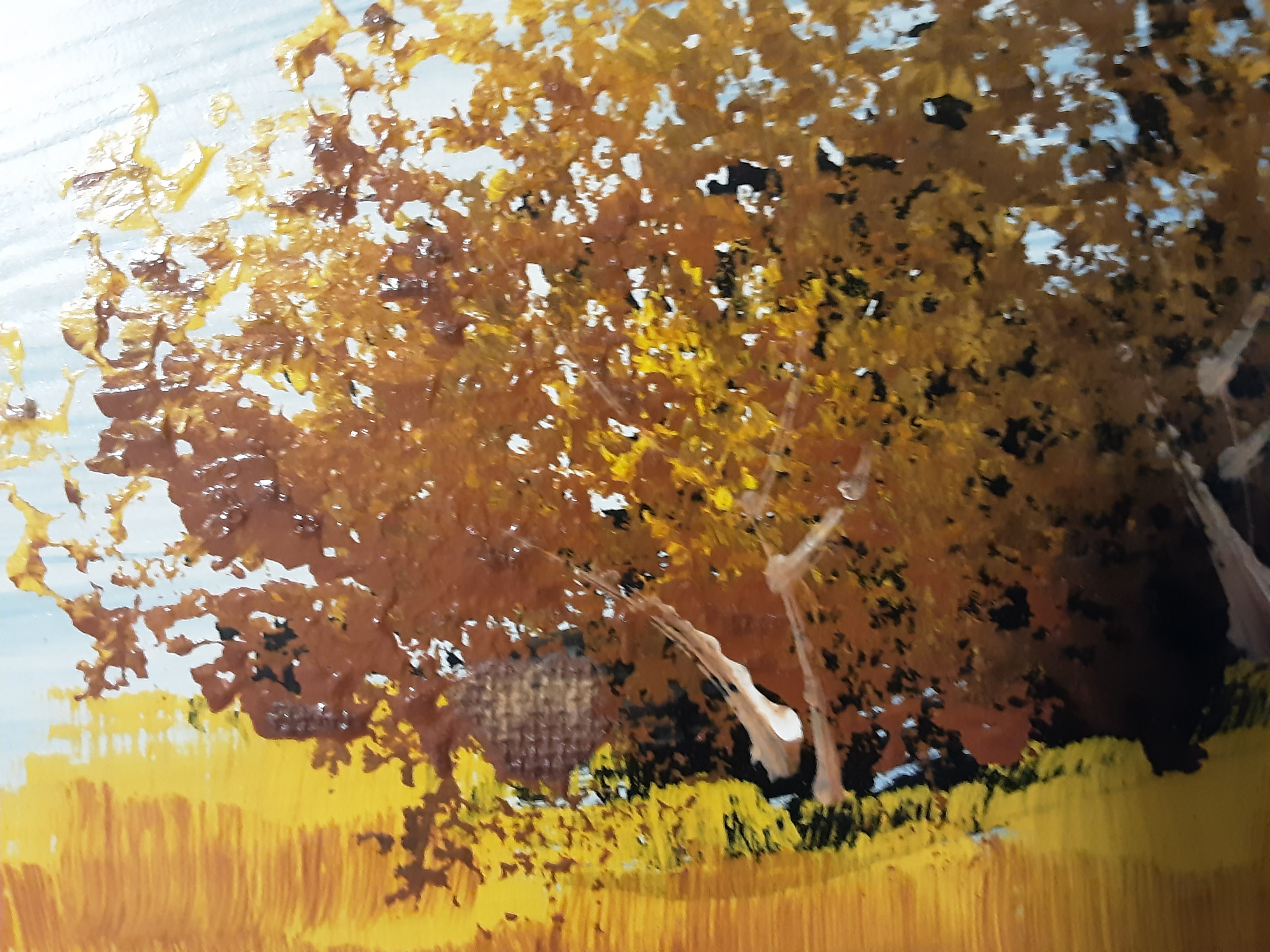 The medium appears to be oil paint on board, evidenced by the visible brush texture and slight gloss seen in close-up shots. The painting's surface also shows impasto-style application in areas like the tree foliage, consistent with oil or thick-bodied acrylic.
