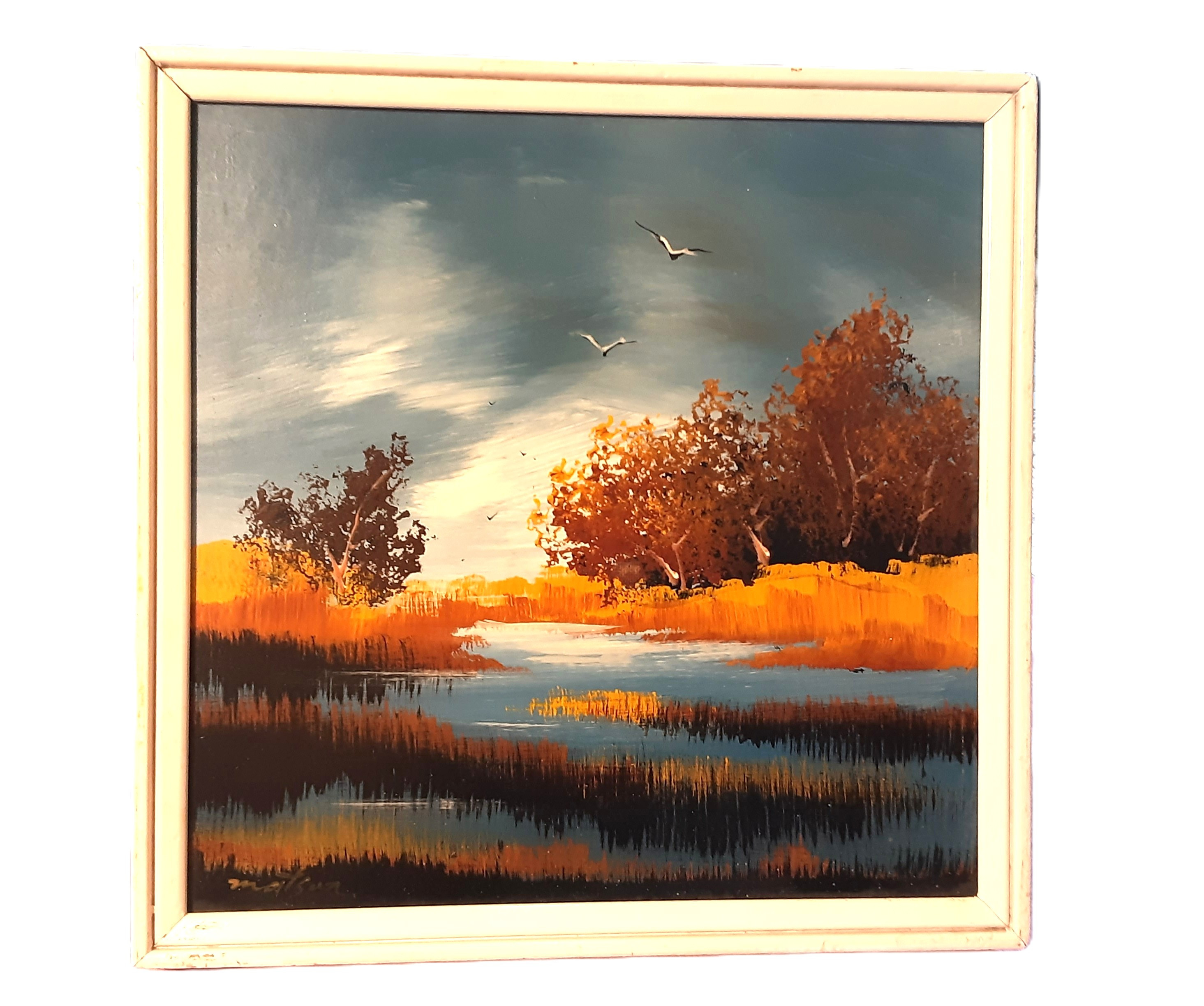 This is a square painting of marshland/wetland with trees and seagulls in the skies.
