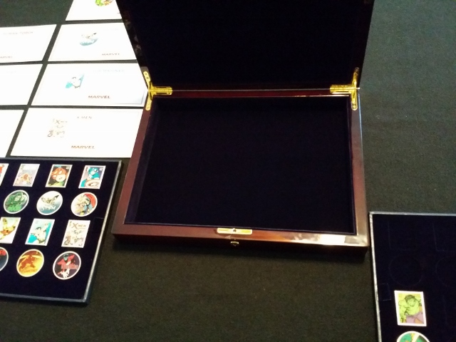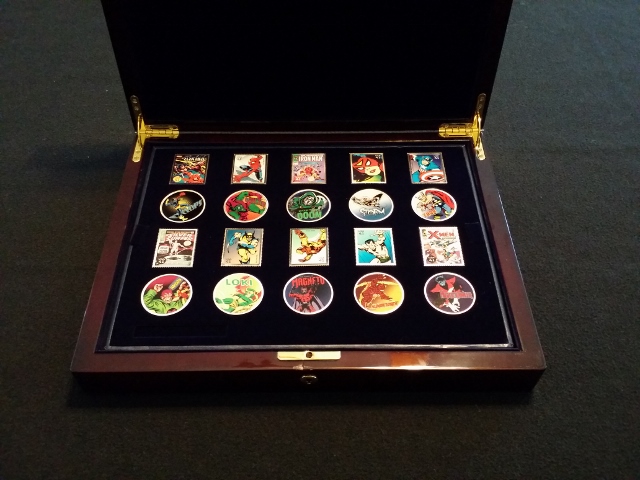 On July 26, 2007, the United States Postal Service issued a sheet of 20 postage stamps featuring the greatest Marvel Comics Super Heroes, including Spider-Man, Captain America, Elektra, the Incredible Hulk, and the Fantastic Four. Marvel's Super Heroes have entertained and inspired generations of Americans ... providing an escape from every day life and making the world a safer place. In 2008, the United States Postal Service authorized each of the 20 Marvel Comics Super Heroes stamps to be minted as a fully colorized solid silver ingot . The collection also includes 20 officially authorized pure silver medallions that feature colorized images of the famous Marvel Super Heroes and villains like Thor, Green Goblin and Loki. The Ultimate Marvel Collection is the only collection of its kind in the world, and is a strictly limited edition. It is officially licensed and authorized by both Marvel and the United States Postal Service. approximately 0.8 oz each and I am told that they cost $90 each when they were first released. I have seen some individual ingots selling on ebay for around $65-$95 each but never a collection this large. This collection includes the custom crafted lacquered wood collector's chest State of the Art Craftsmanship Each stamp ingot and medallion in the The Ultimate Marvel Collection is meticulously crafted by the world’s most skilled artists and minters, Hallmark Group possibly.The painstaking process starts with a steel minting die that is the exact size of the original stamp. When the craftsmen are satisfied that the master die is flawless, only then is it placed into a massive proofing press. Polished .999 fine silver blanks