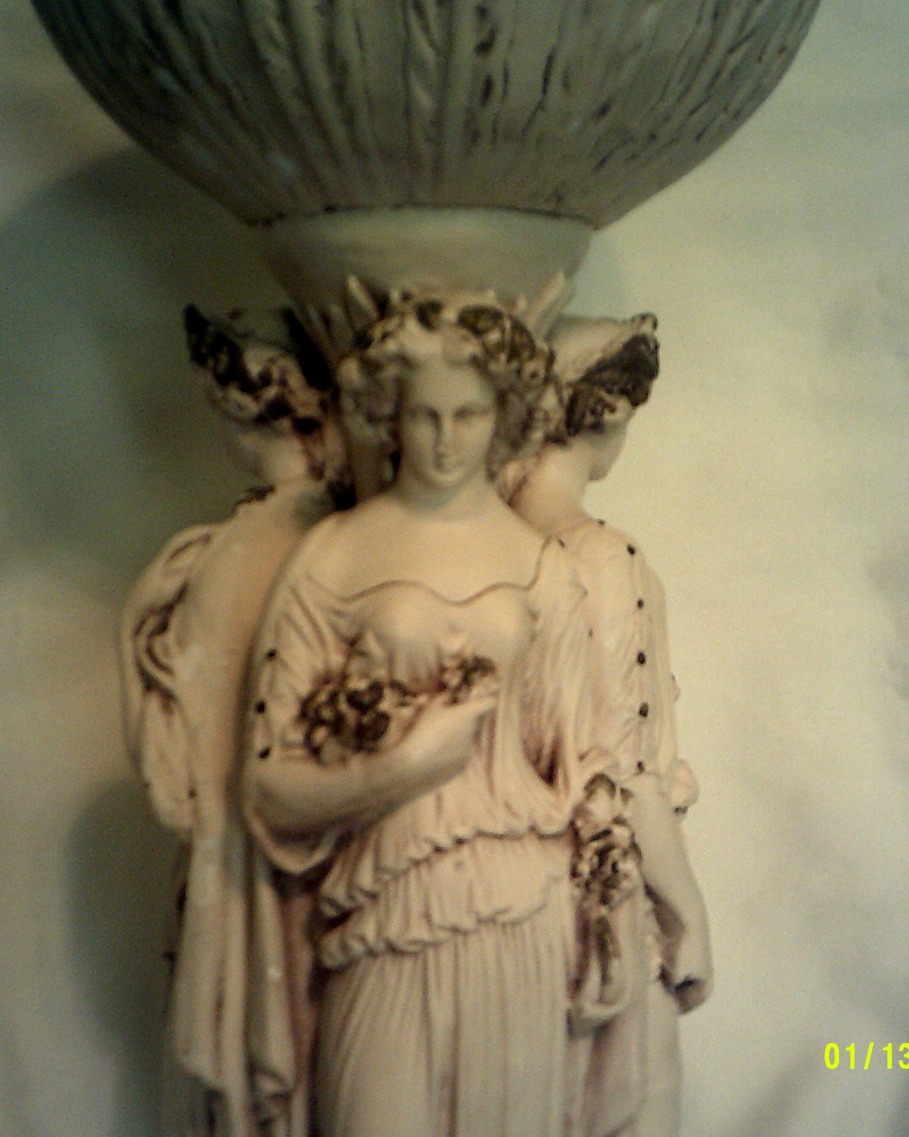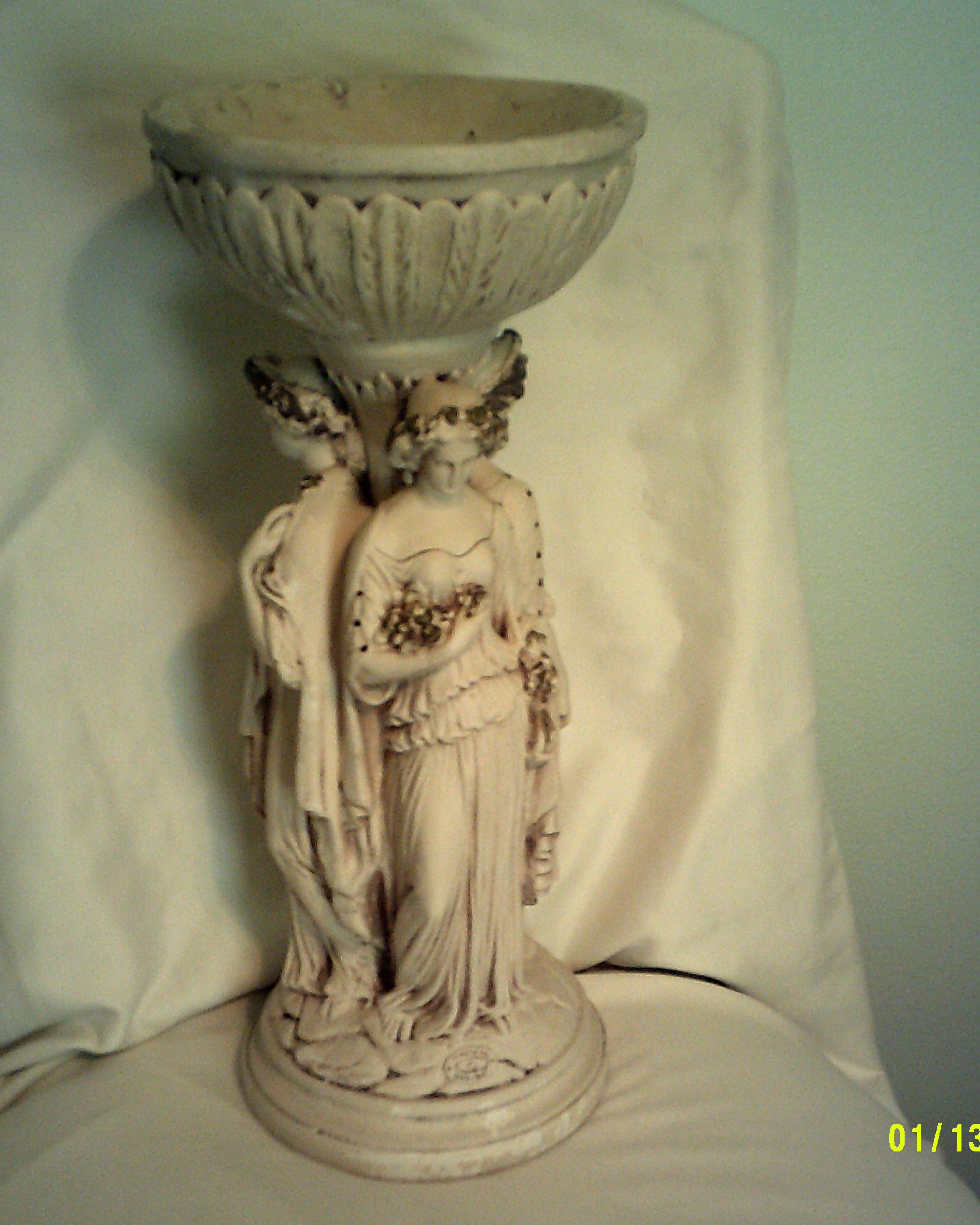 Apart from a few slight scuffs here and there, this plant holder is in good condition. I'm not sure how old it is or what its worth is, but it's been in the family for many years. Boasting 3 beautiful women, it also has a stamp on the base that reads: Marwal IND. INC.