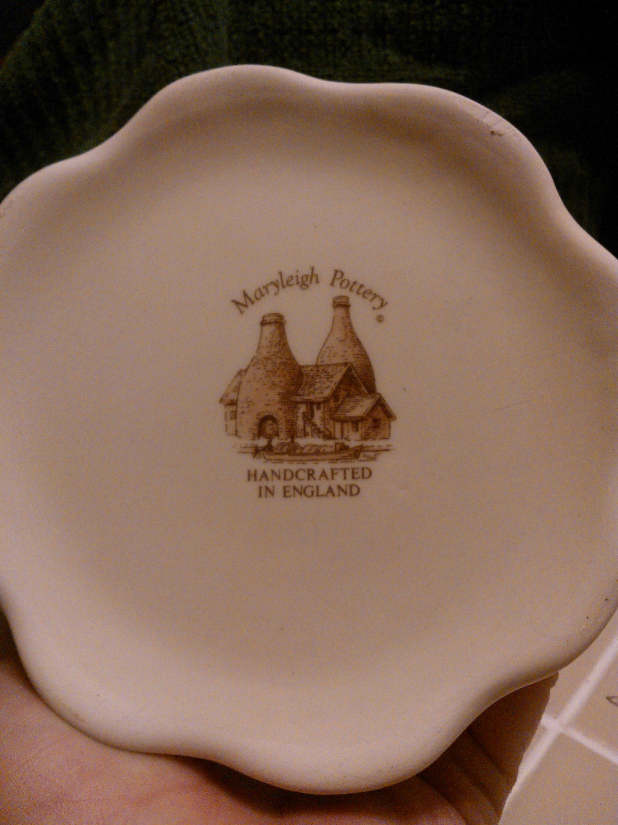My family received this bathroom set from a family friend for our garage sale. But after looking at the entire set and the work that was put into it we decided that maybe its something that she might not want to sell. Its 13 pieces... Soap dish, Mug, Glass, Counter toothbrush holder, Taper candle stick, Wall toothbrush holder, Towel rack, cupid candle holder, small covered bowl, large covered apothecary jar, soap dispenser wall cupid vase and toilet brush holder. Looking to see what this is actually worth.