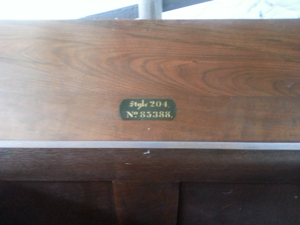 Mason and Hamlin organ company. Painted on. 2 wooden coins. One of Napoleon III. The other koenic von boehmen. Under lid. Style 204 and No.85388.