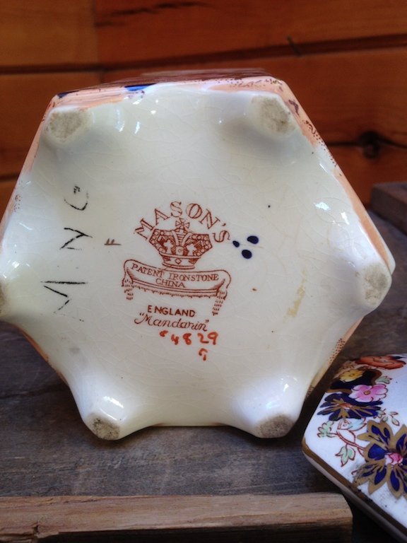 Mason's Paten Ironstone China Tea Caddy. Mandarin design. I would like to know more information about this item; the age & about the markings on the bottom, the initials and the number "4829". I would also like to know what it may be worth.