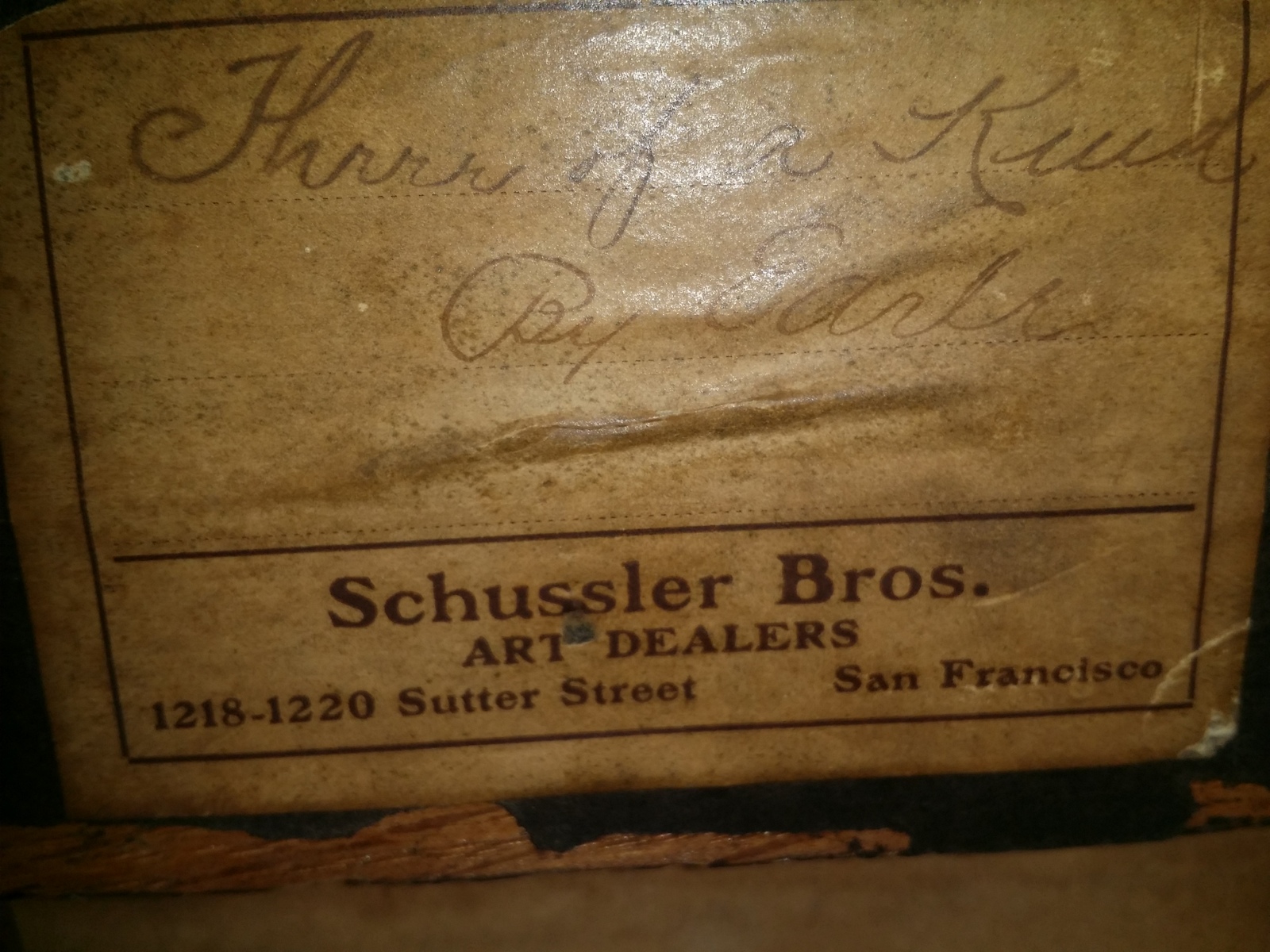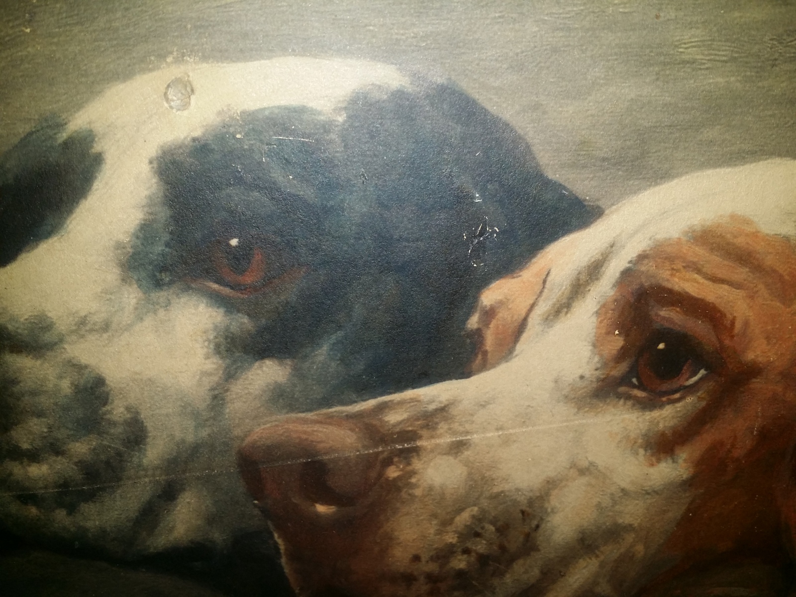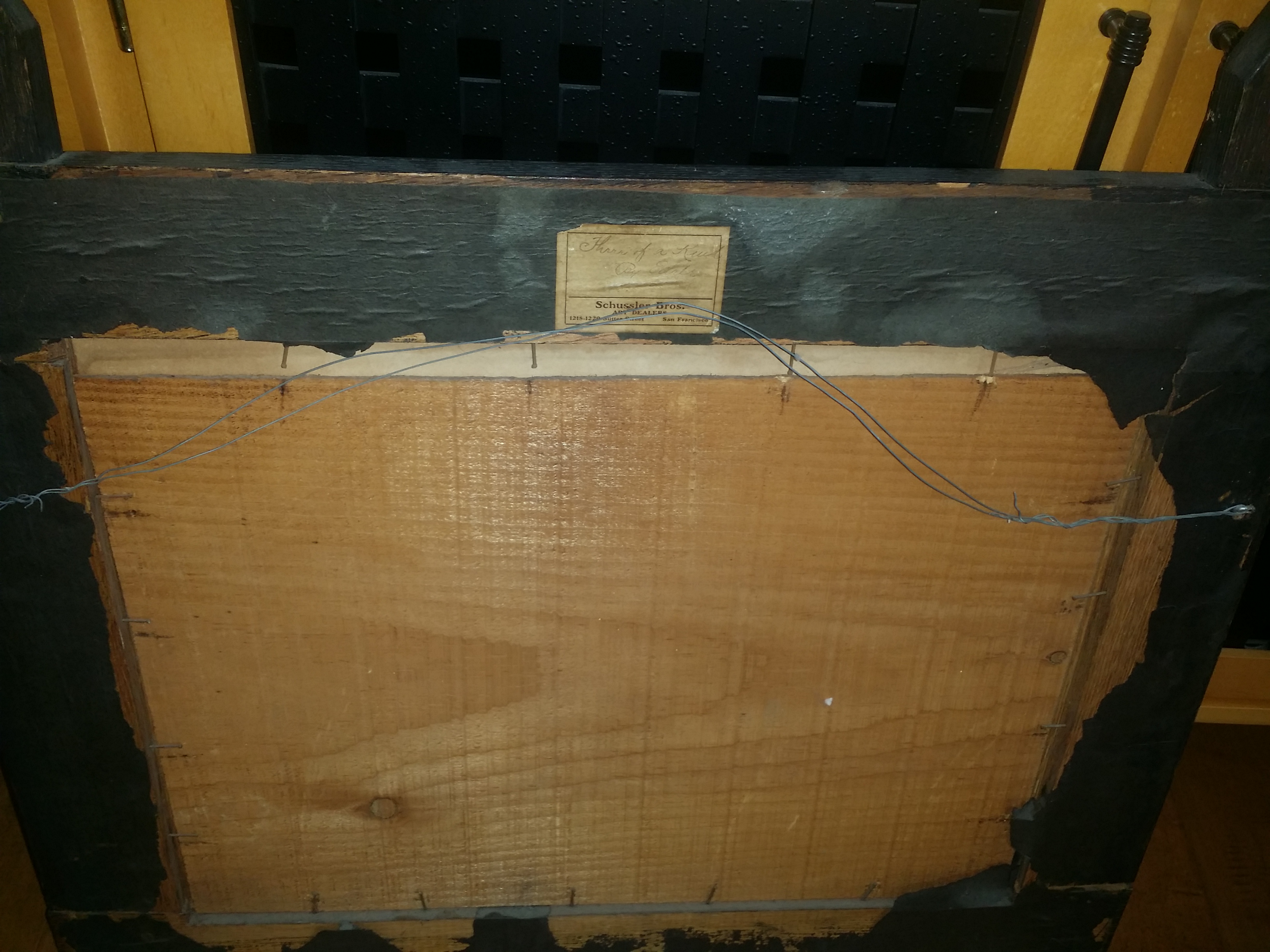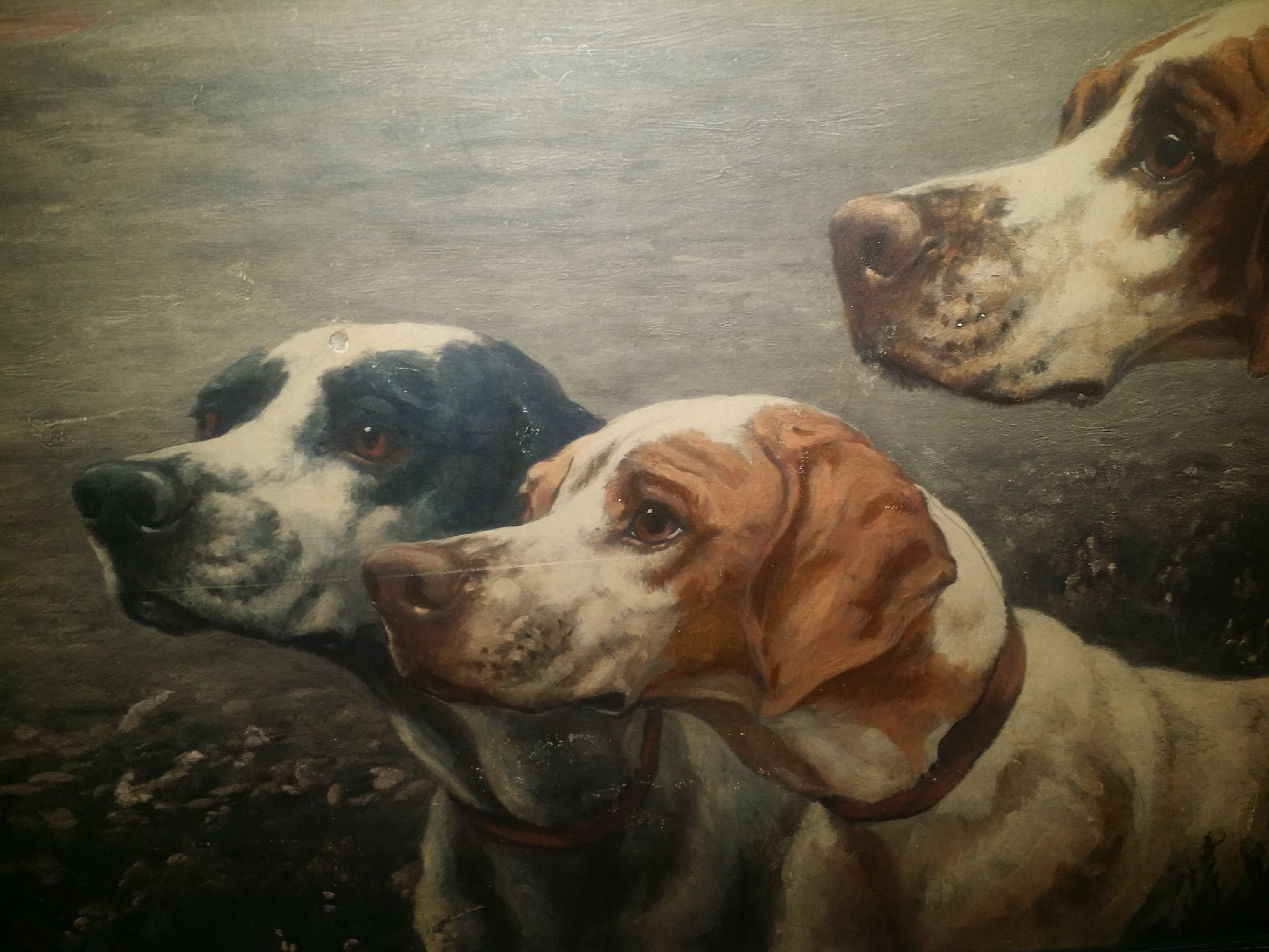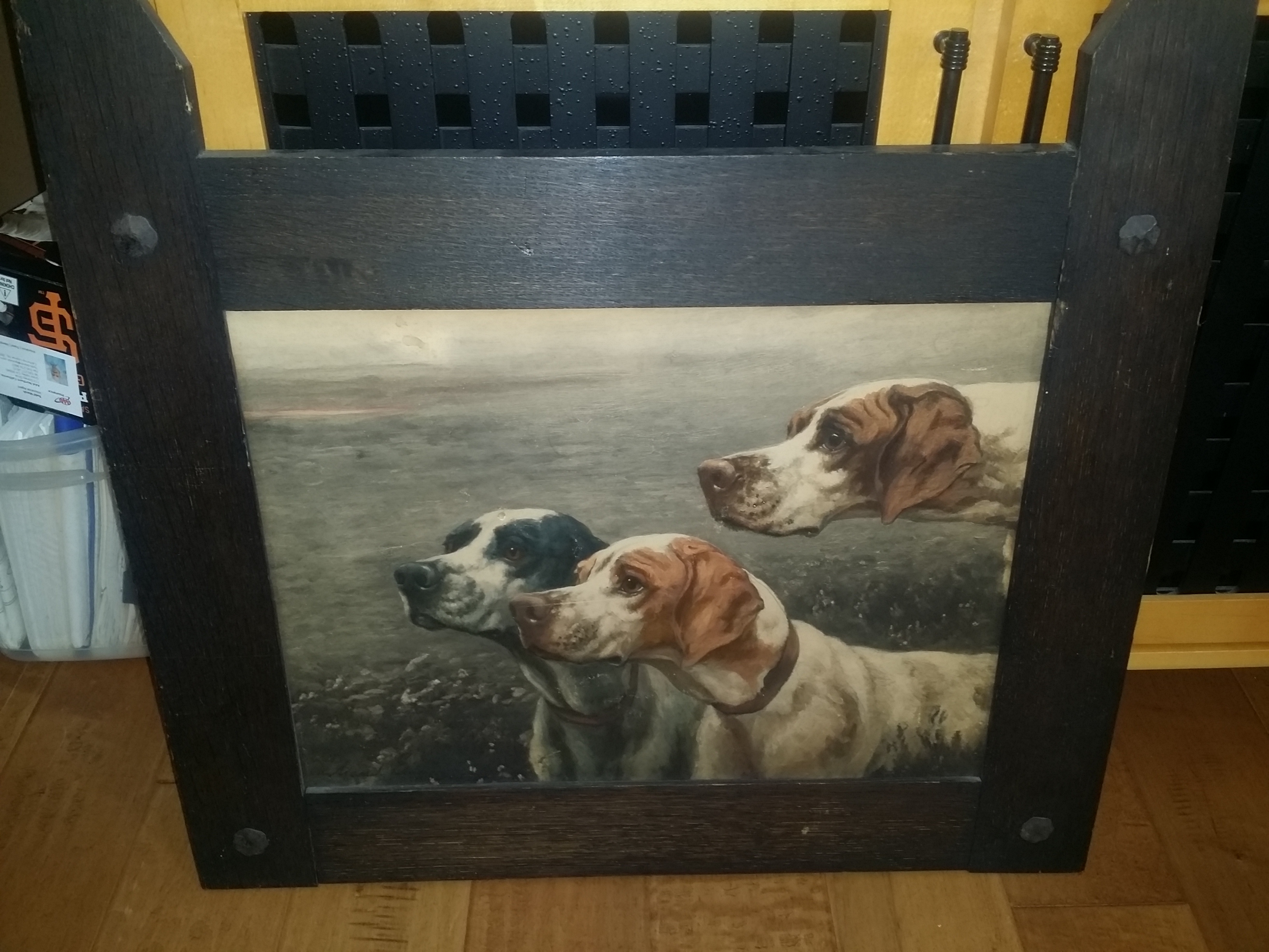 This is a mission framed period print on board or three American pointers. Tag on back says "three of a kind" By Earl. Schussler Bro. 1218-1220 Sutter St. San Fransico.