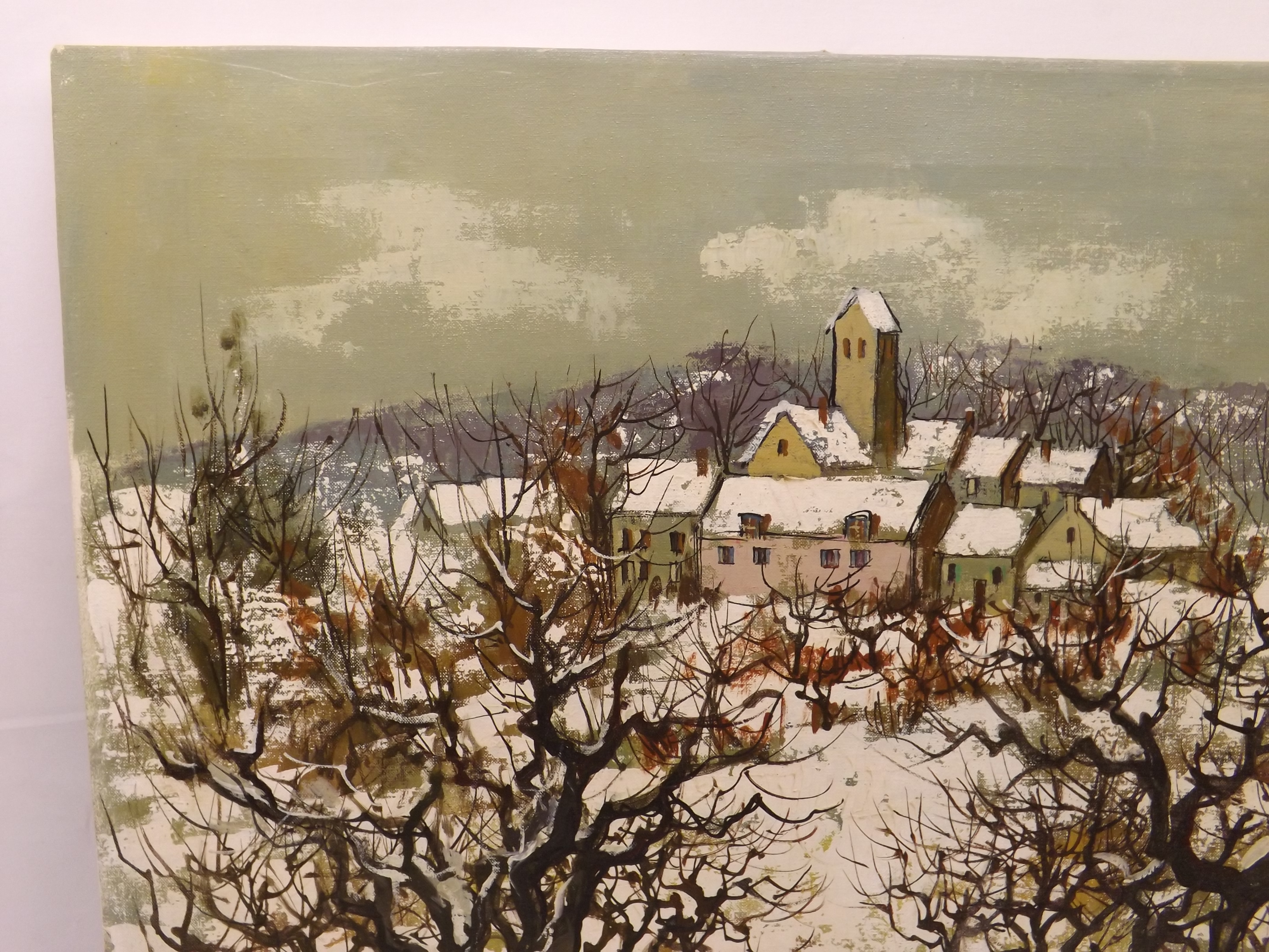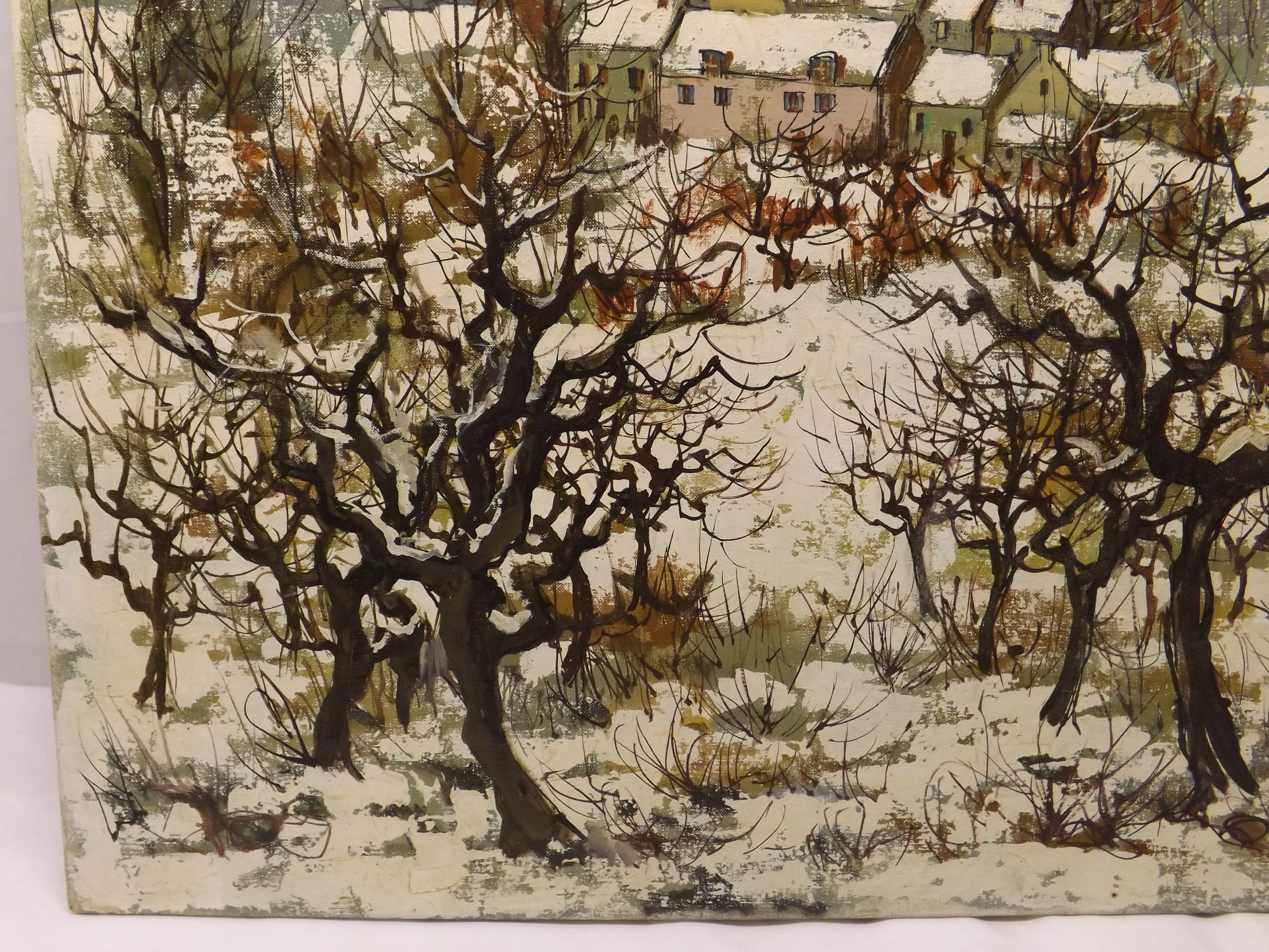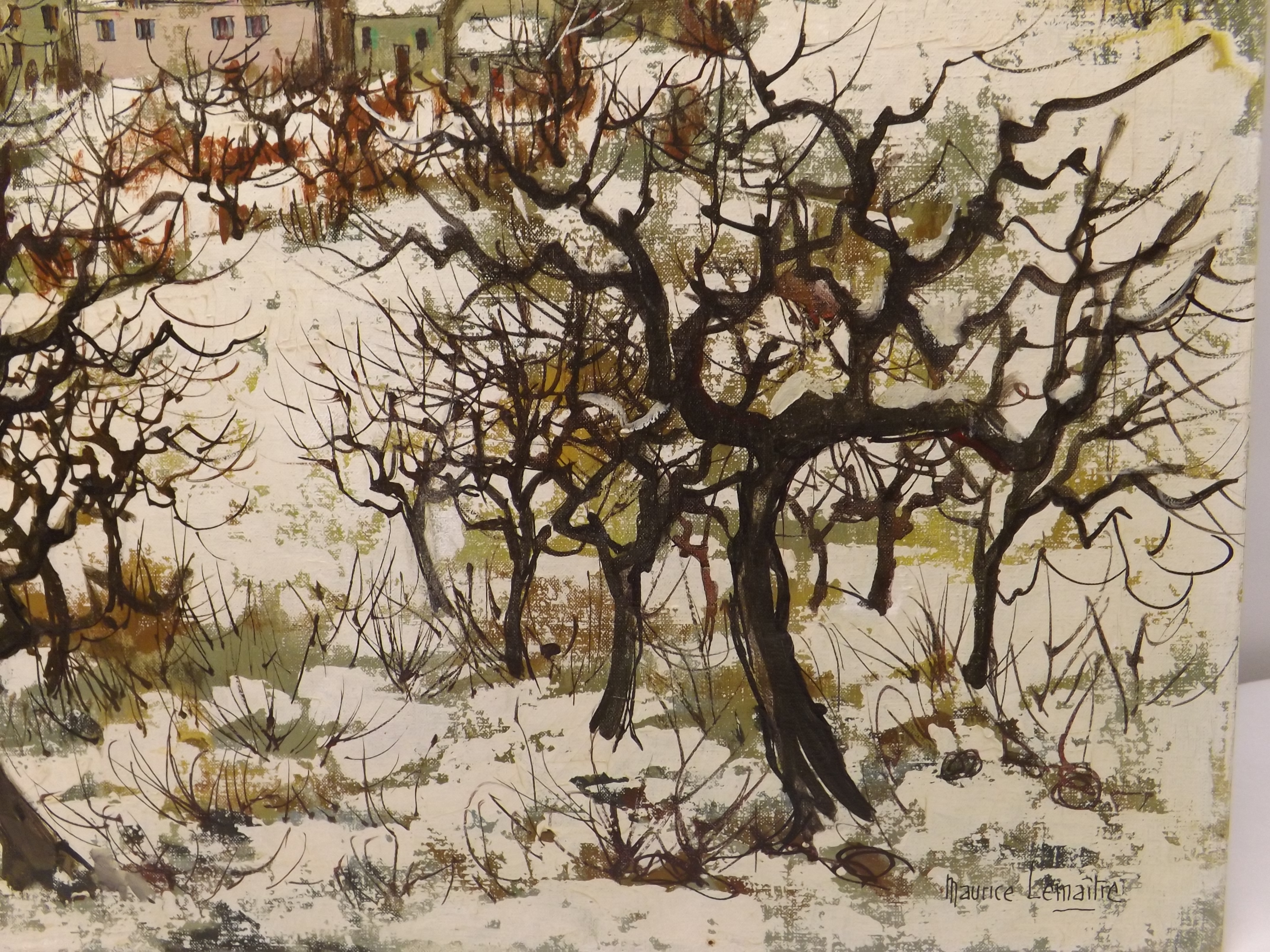 20" x 24" oil on canvas painting signed Maurice Lemaitre. Winter scene countryside view of a small town. Seems to need a cleaning. Picked this up at an estate sale that had quite a few painting of Paris landscapes.