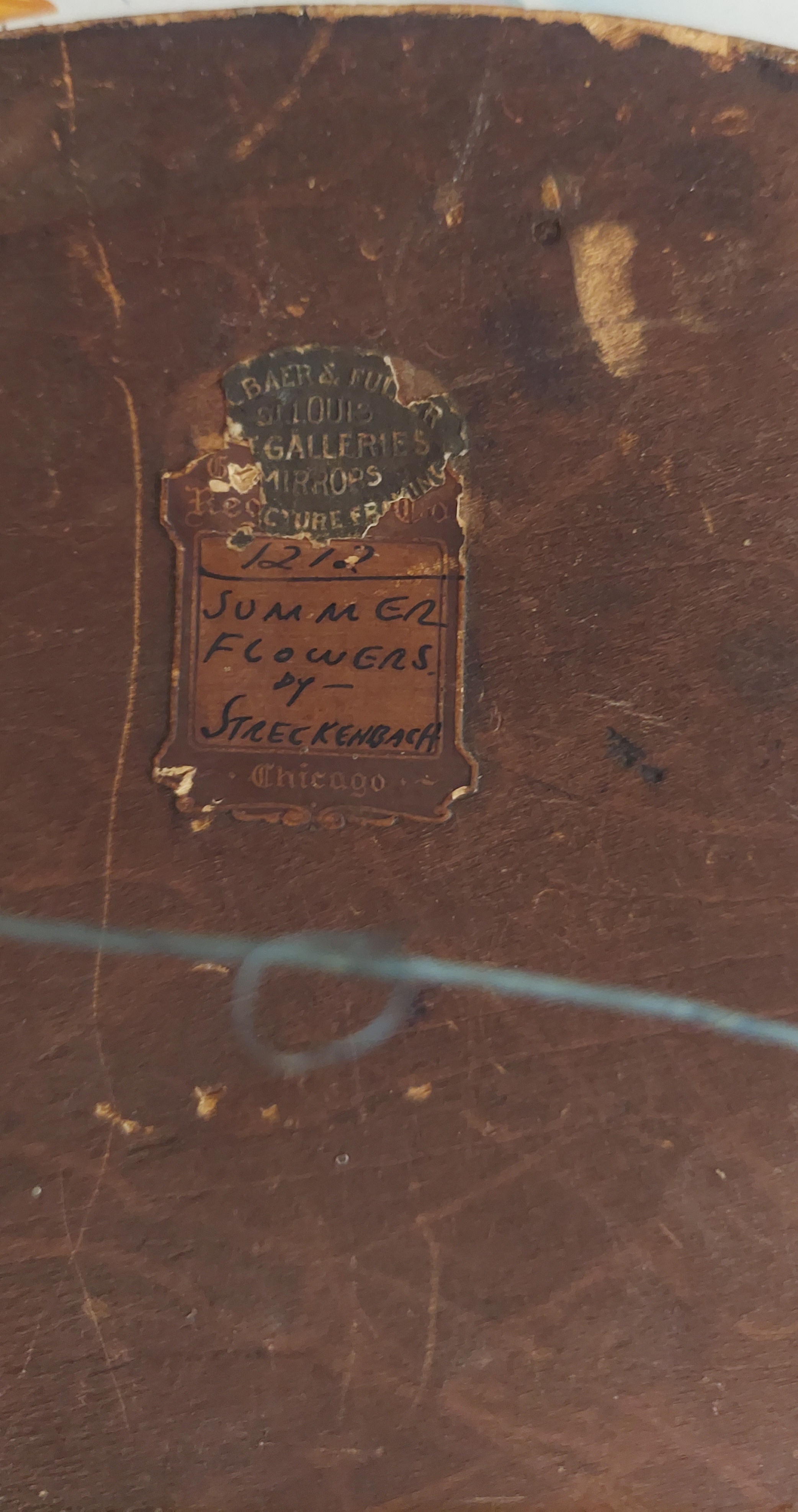 About 4 years ago a friend of my husband gave me around 8 of his late mother's antique artwork. She was an antique dealer in Northwest Washington by Seattle. I picked out the pieces that spoke to me. There was an oil painting that I could tell was very old due to the frame it was in, the tags on the back of the frame and the painting itself was darkened. I immediately grabbed it and had it tucked away until recently. My grandmother passed away about a week ago. She lived with us and as I was going through her things I came across the painting. I was curious as to what it was exactly so I Googled the name on the tag "Streckenbach". Boy was I surprised to see how much original artworks by him were going for. I couldn't find anything comparable to the painting I have. I'm guessing it is one of his earlier works but I'm not sure. I haven't done anything to it. The frame, the painting is still the exact way I got it. There are some abrasions on the frame and a slight crack in the middle but I would love to see what you guys think. Thanks.