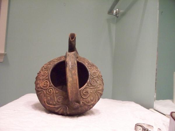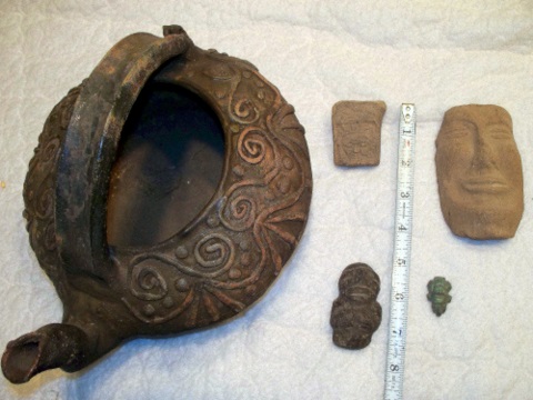 I bought these items when I was in Guatemala 10 years.The smaller items came from a market in Chichicastenango.The pouring vessel came from the same town but from a small store that dealt with antiques.I think I paid $20.00 for it.The pot appears to be made from clay and has a glaze on the upper part.It is about 1/4" thick.Its weight is a little over 1 lb.