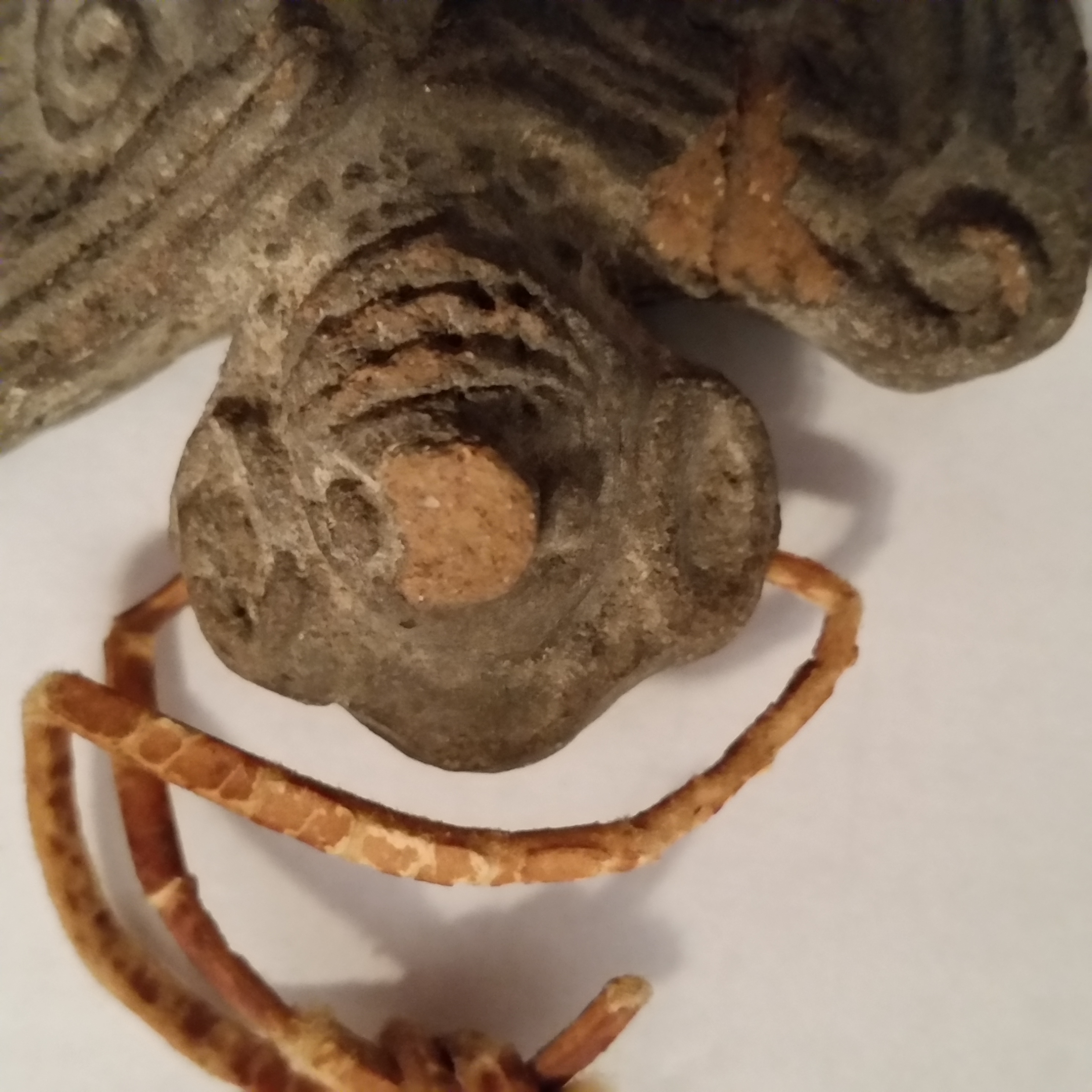 Made of either stone or clay. Looks like a bat or a demon. It looks like it could be the mayan bat god Zotz.