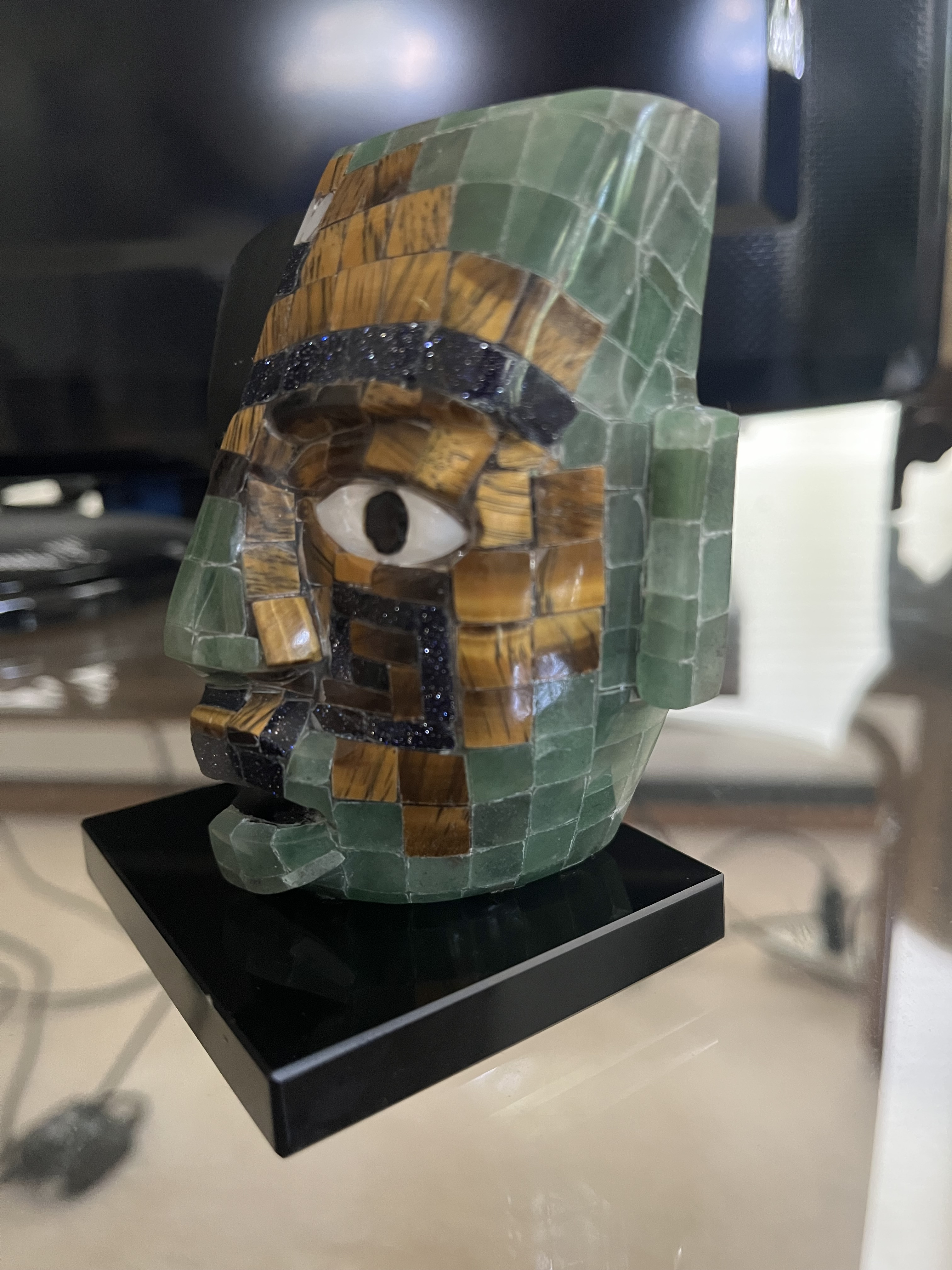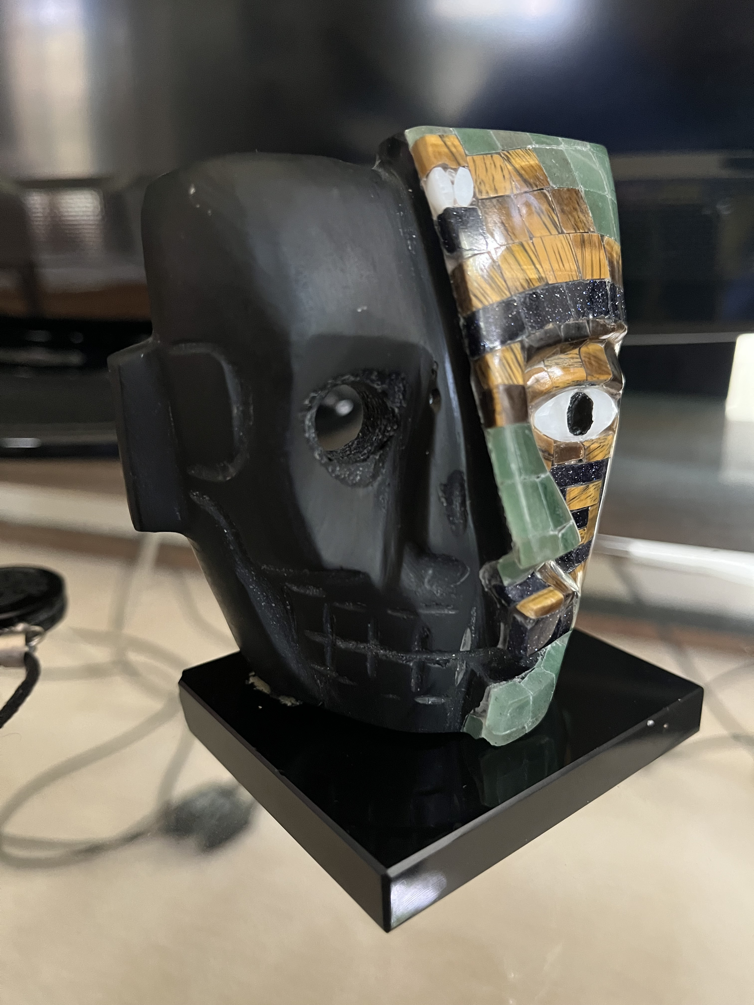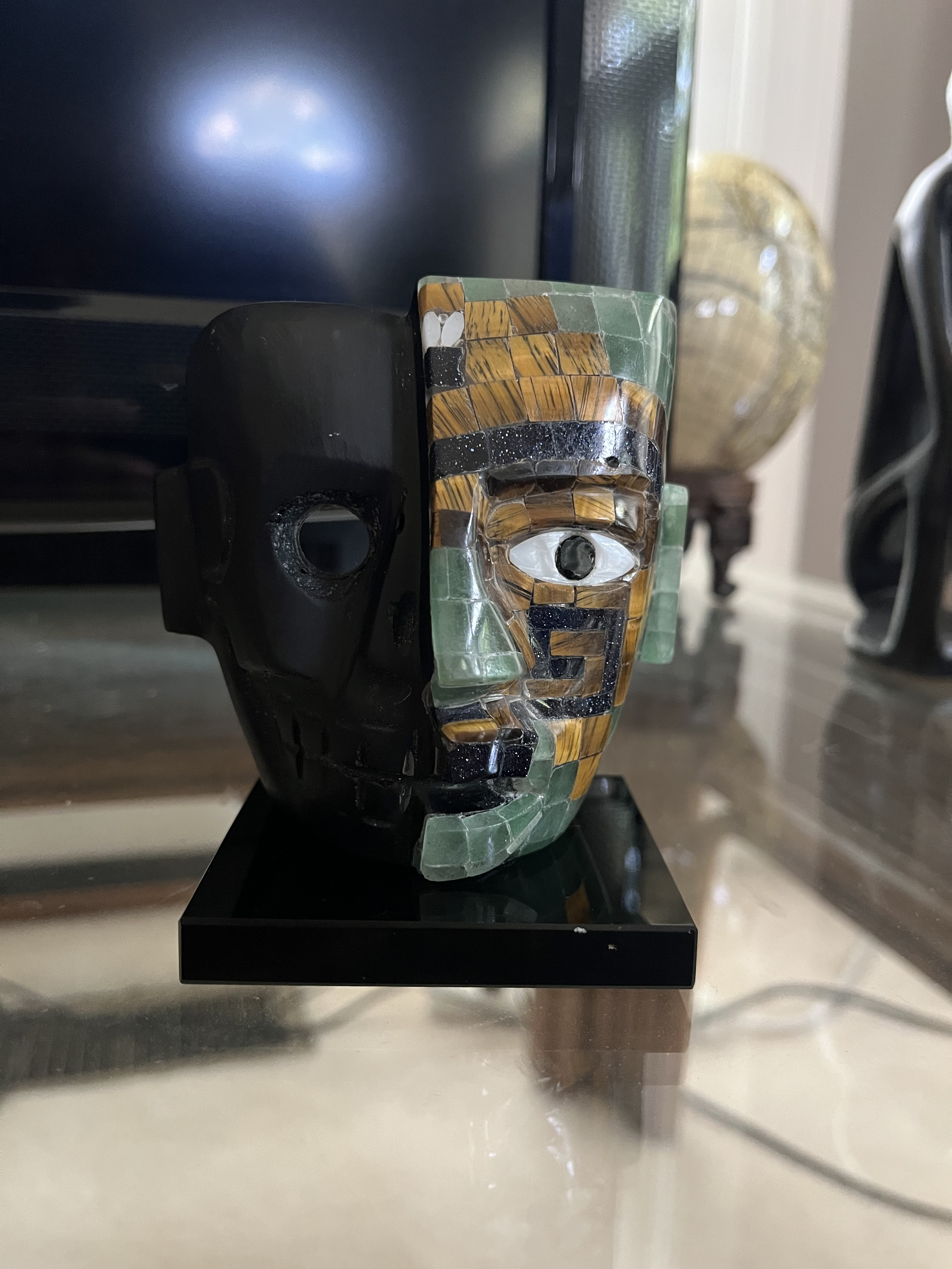 Description: This striking mask features a dual design, with one side crafted from black obsidian and the other from a mosaic of jade and jasper. The intricate detailing includes an eye made of obsidian, showcasing the craftsmanship of the local Mayan community. The mask is mounted on a sleek black base, enhancing its display appeal.