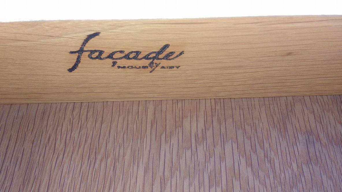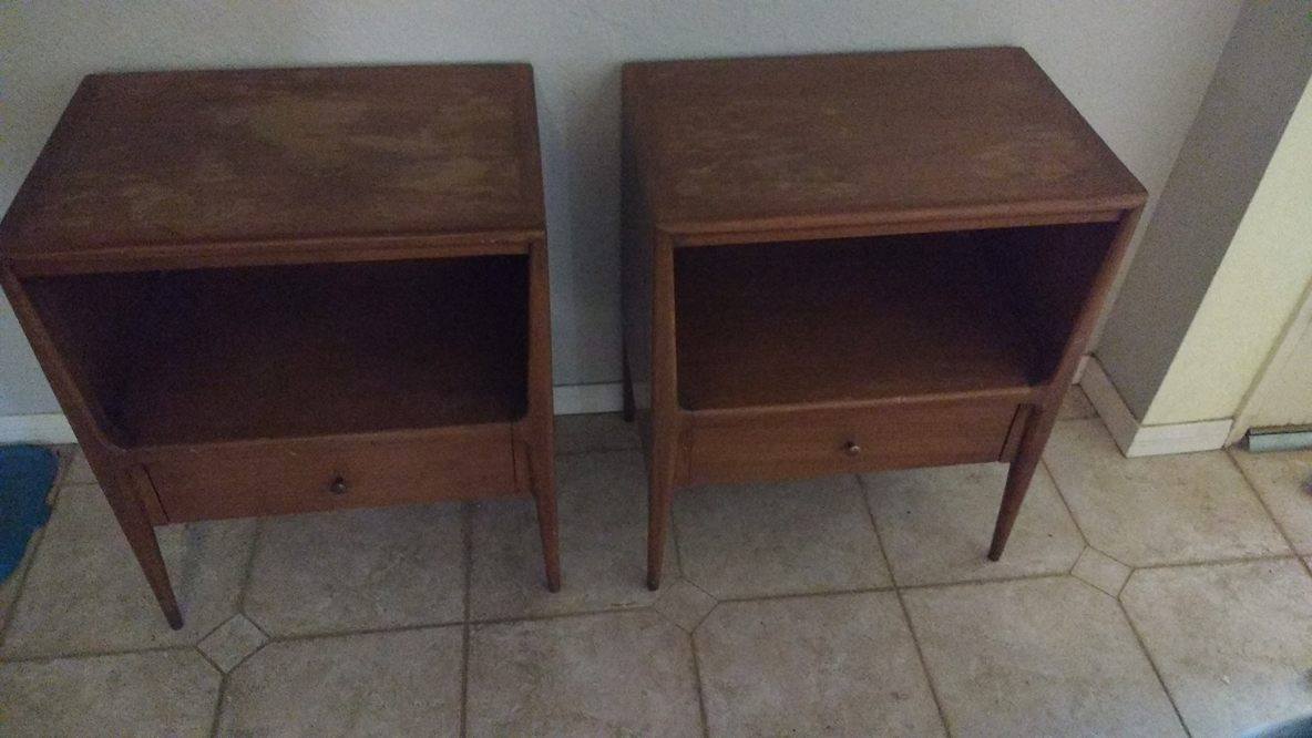 Heavy walnut(?) end tables or nightstands. Facade by Mount Airy
