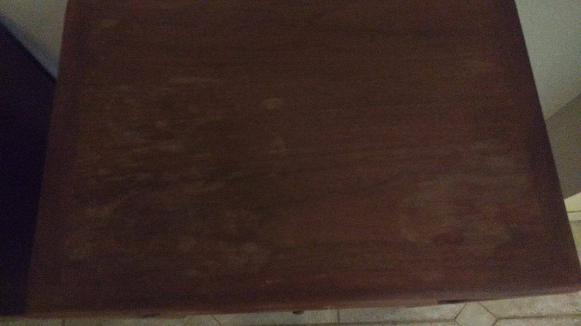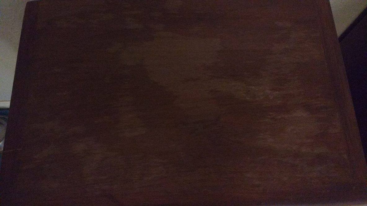 Wear on top. one spot on shelf. both drawers are in tact. scratch and small chip on side