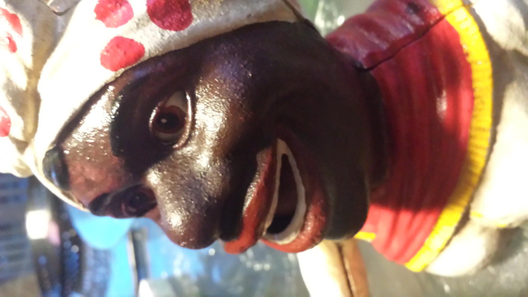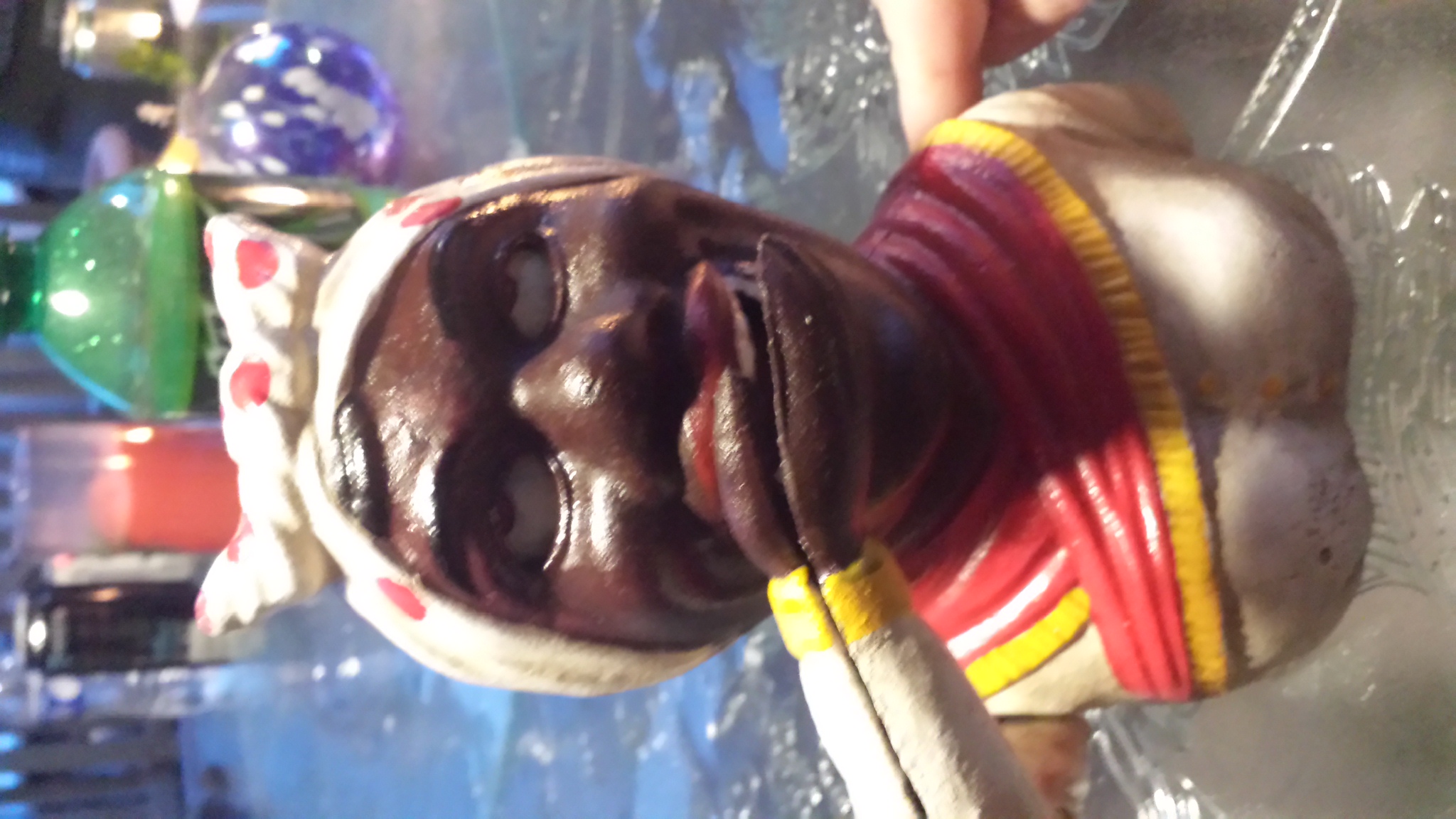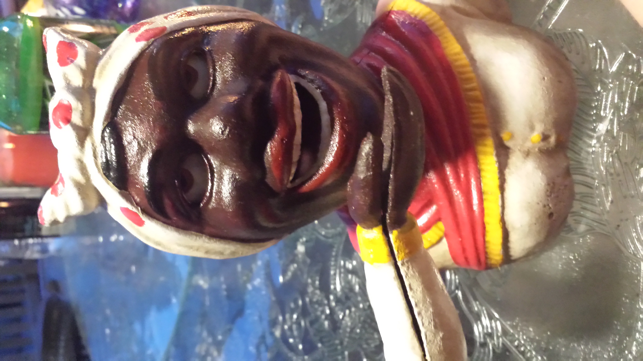 this is an old mechanical bank the black lady with a white hat with red dots looks to be in original possibly repainted at some point in its life working condition on the bottom it has a flat head screw to unscrew the bottom it also says je Stevens patent number 455 1889
