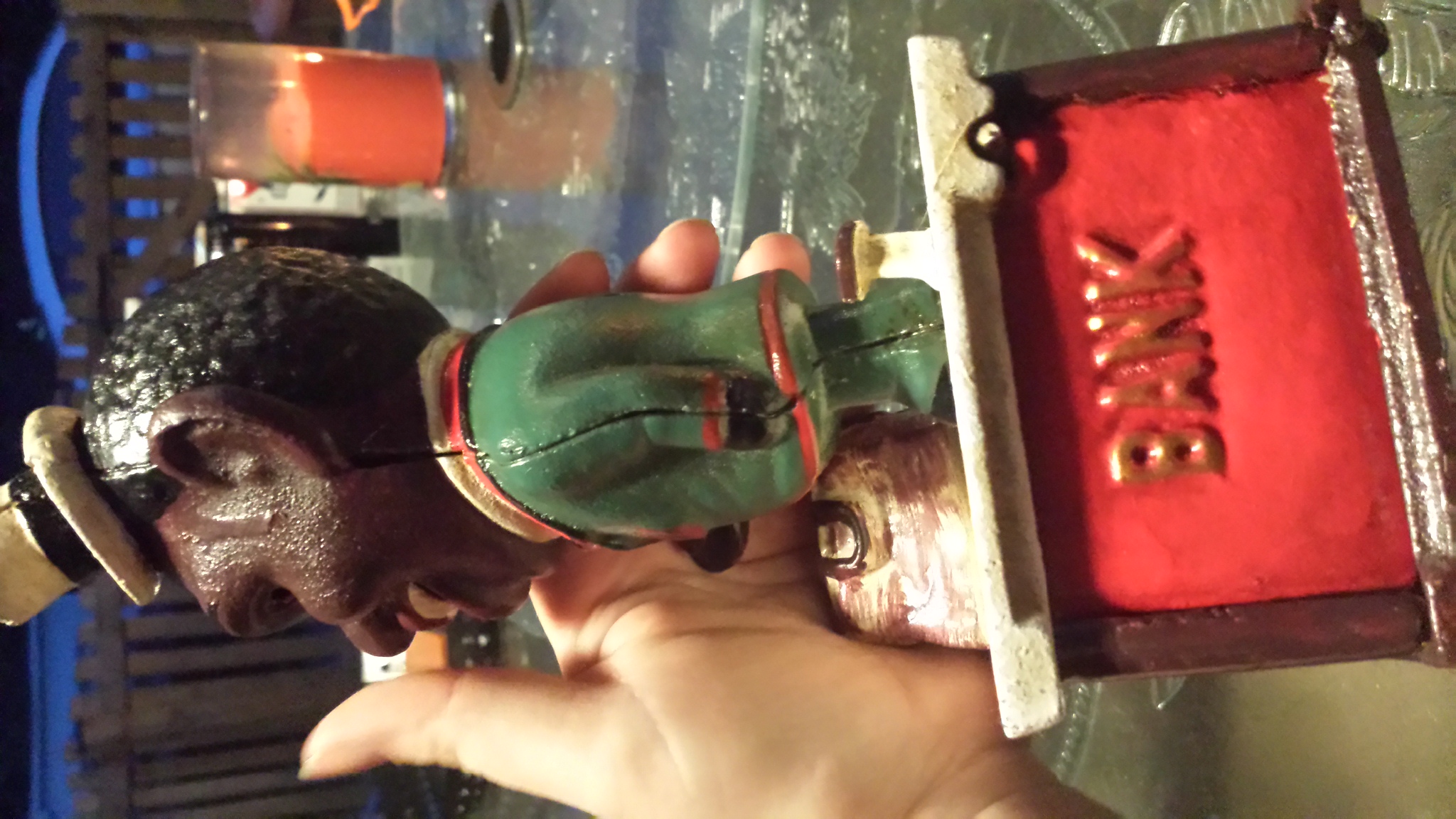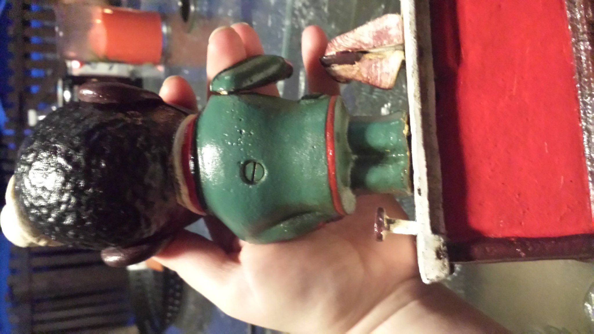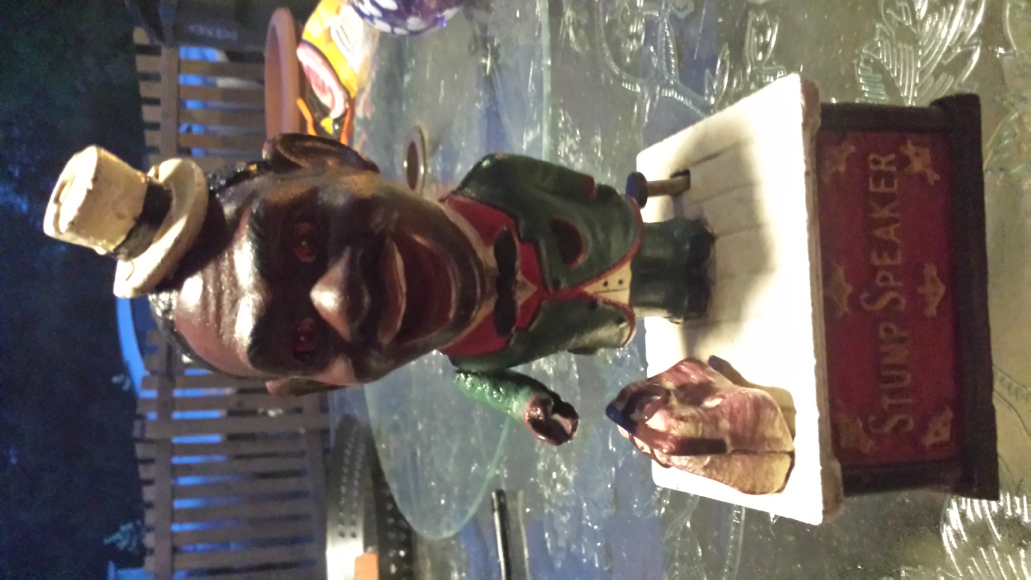 this is a cast iron mechanical Bank stump speaker is across the front of it looks to be an original possibly repainted over time