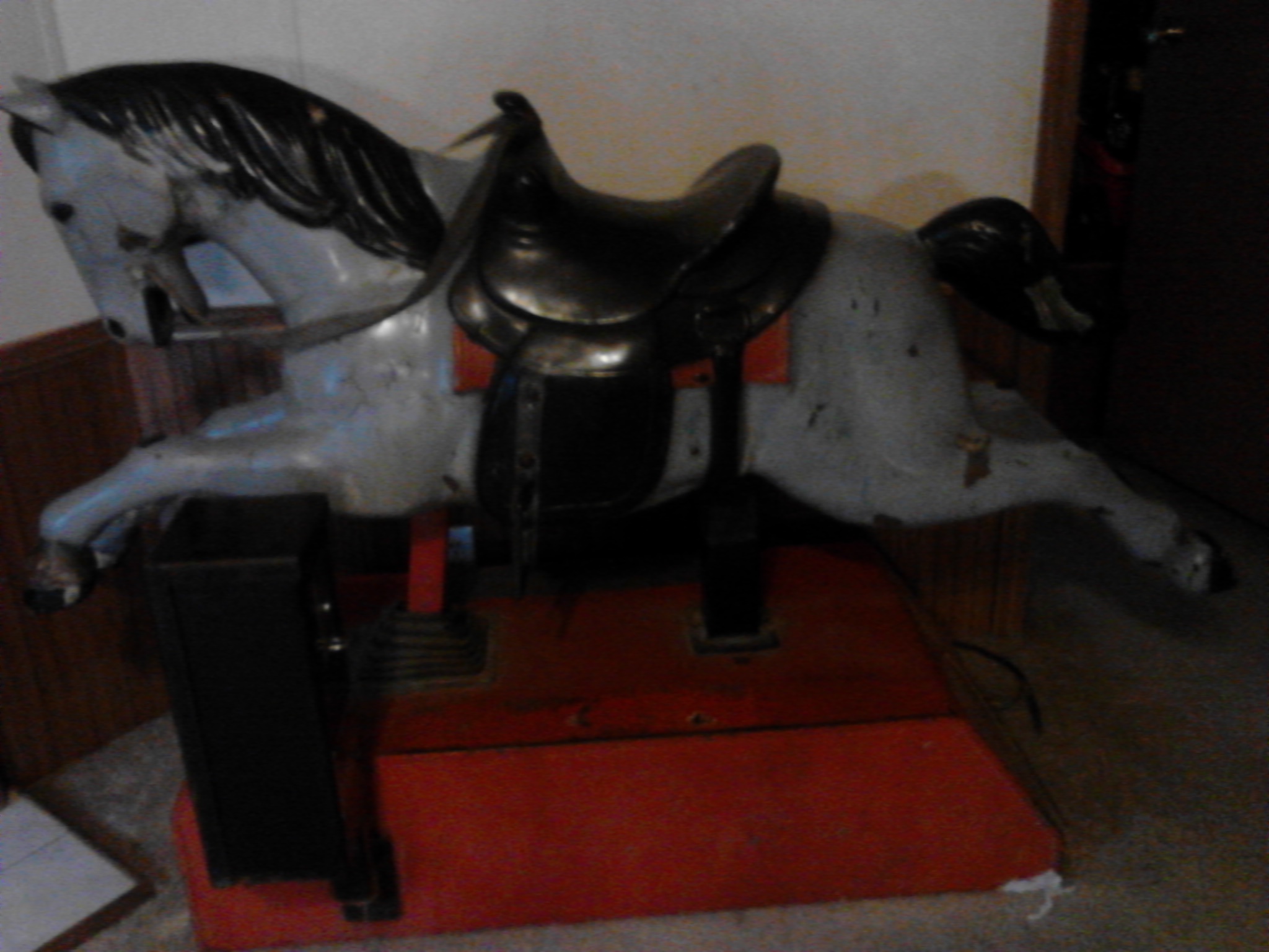 Mechanical coin-operated horse it runs good and plays music. There are few paint chips. We do not know how old it is. But we would like to know how old it is and what it is worth