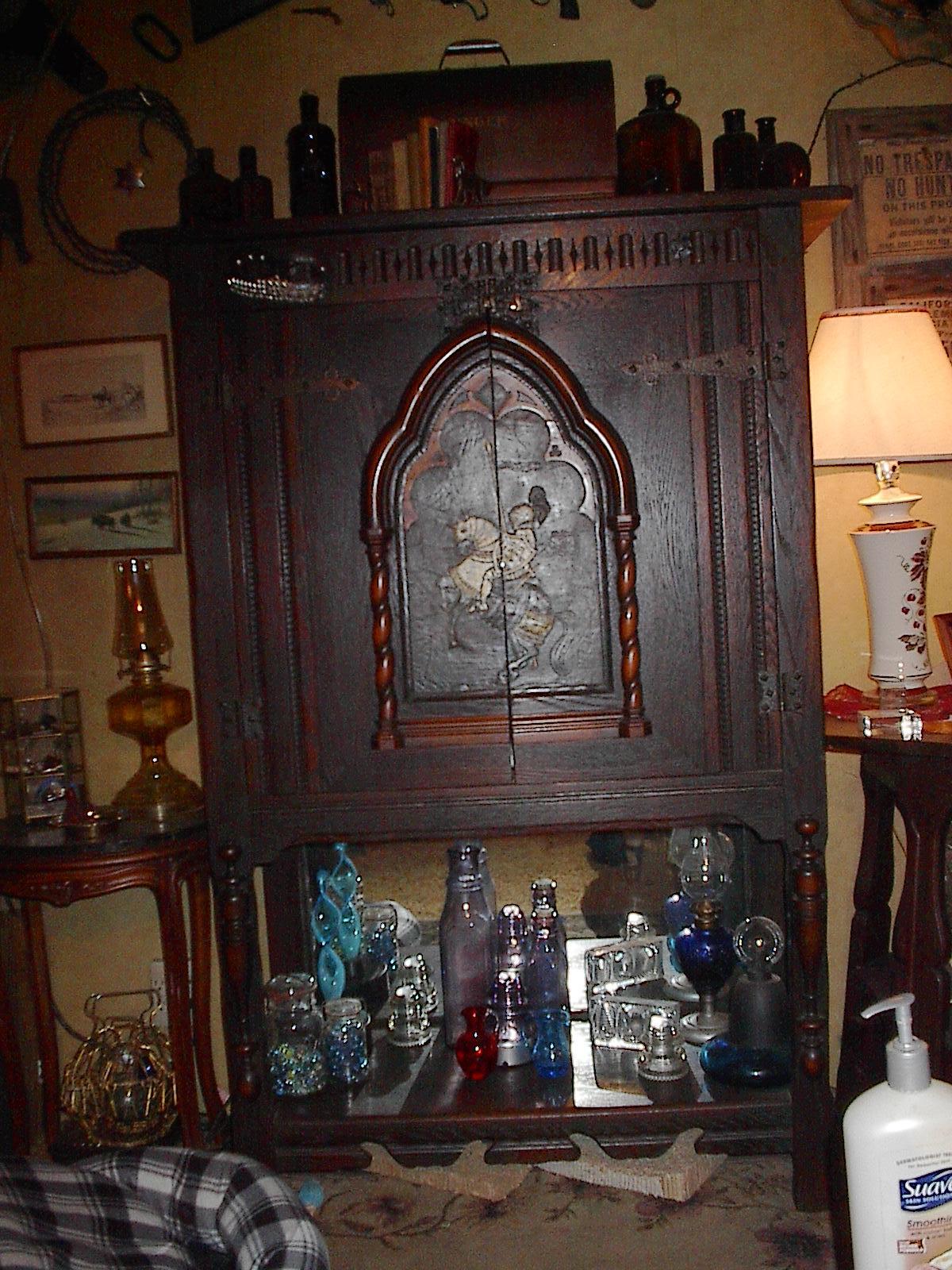 oak cabinet is 59 1/4 " high 36"wide 15 1/2" deep. Top piece hangs 3" over on each side. The front panel is tooled leather of a knight in silver on his horse on his back legs. I can not find any oak cabinet with leather design on front panels on any websites. Any information would be very much appreciated. Thank you for your time There is a drawer above the cabinet doors that is 3" high