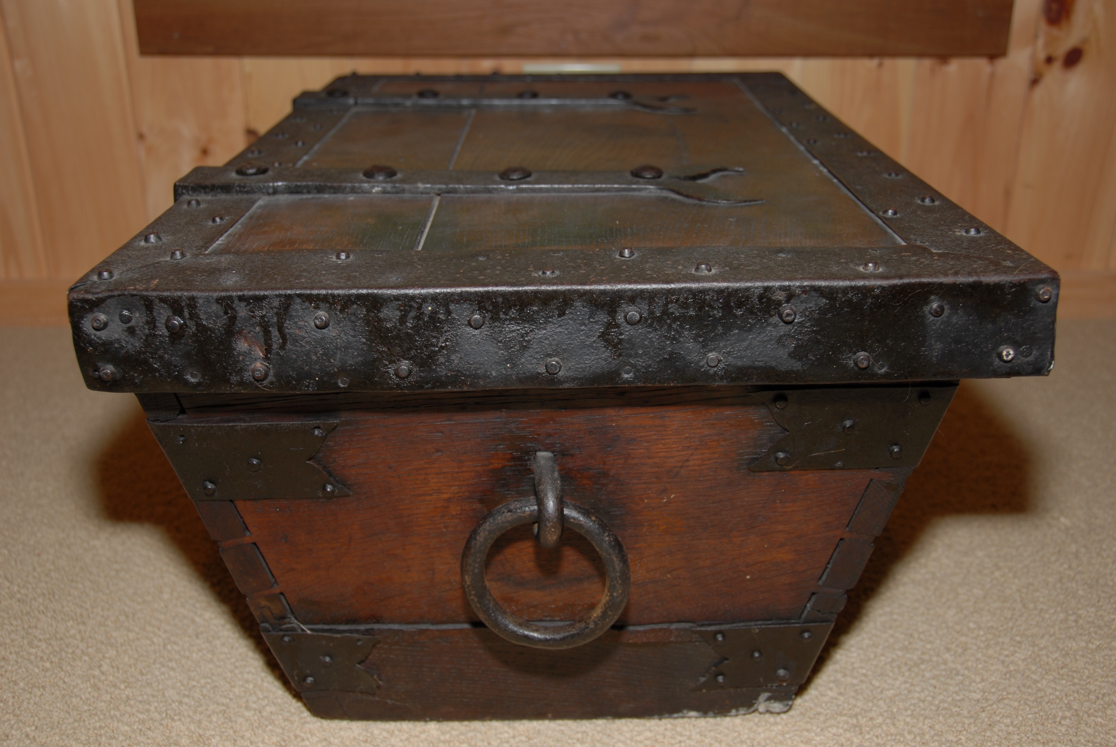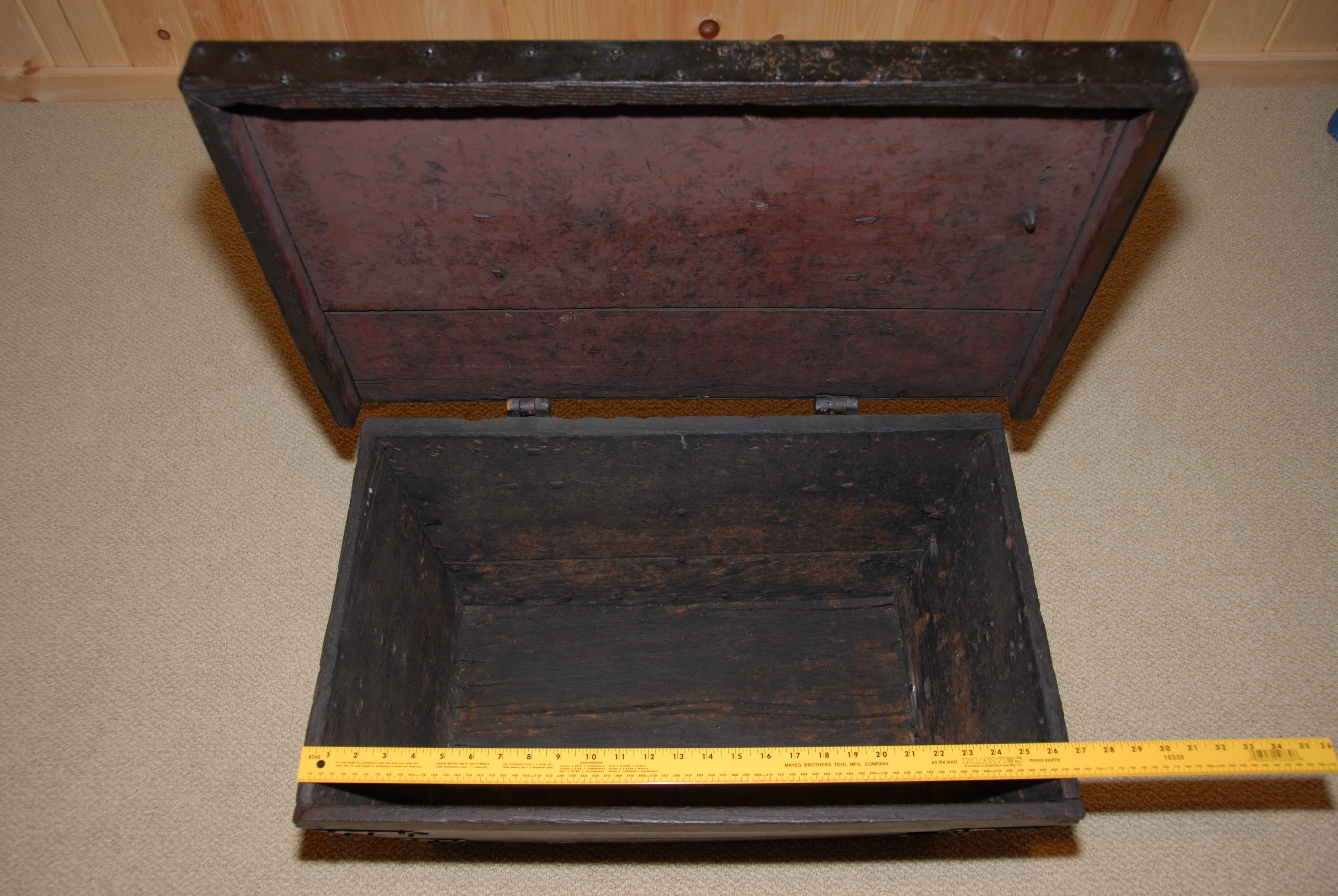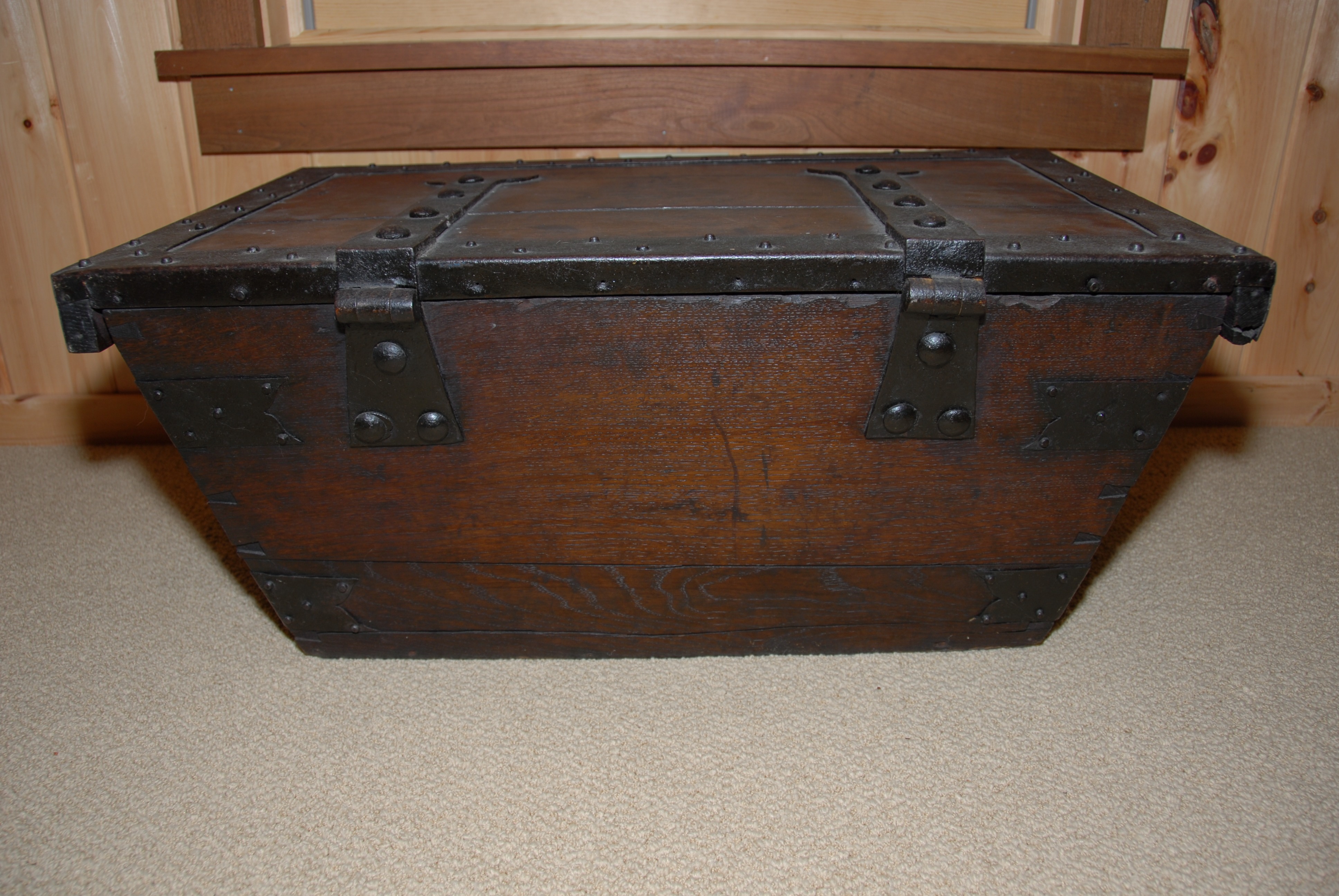 Large trunk (one of exact pair) purchased 1960s London, England antique store. Was told trunk used as a holder for ship's cannon balls.