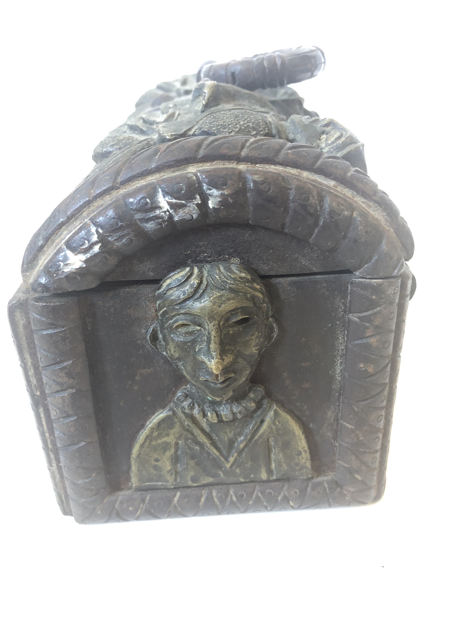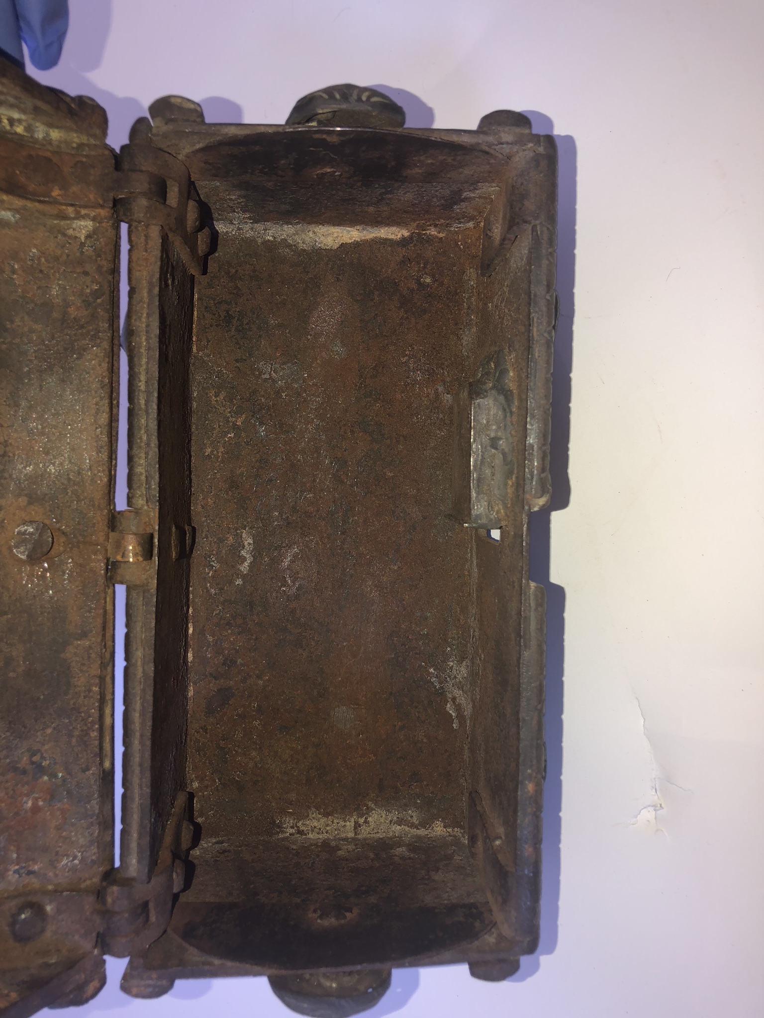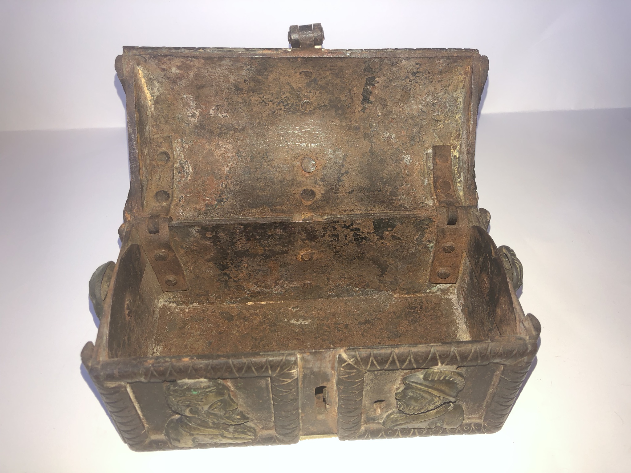 I believe this is possibly and English or Italian wrought iron medieval casket box based on some information I gathered from other sites. It weighs approximately 8 pounds. A few parts are missing or broken off as shown. No lock. I don’t have much other information about it.