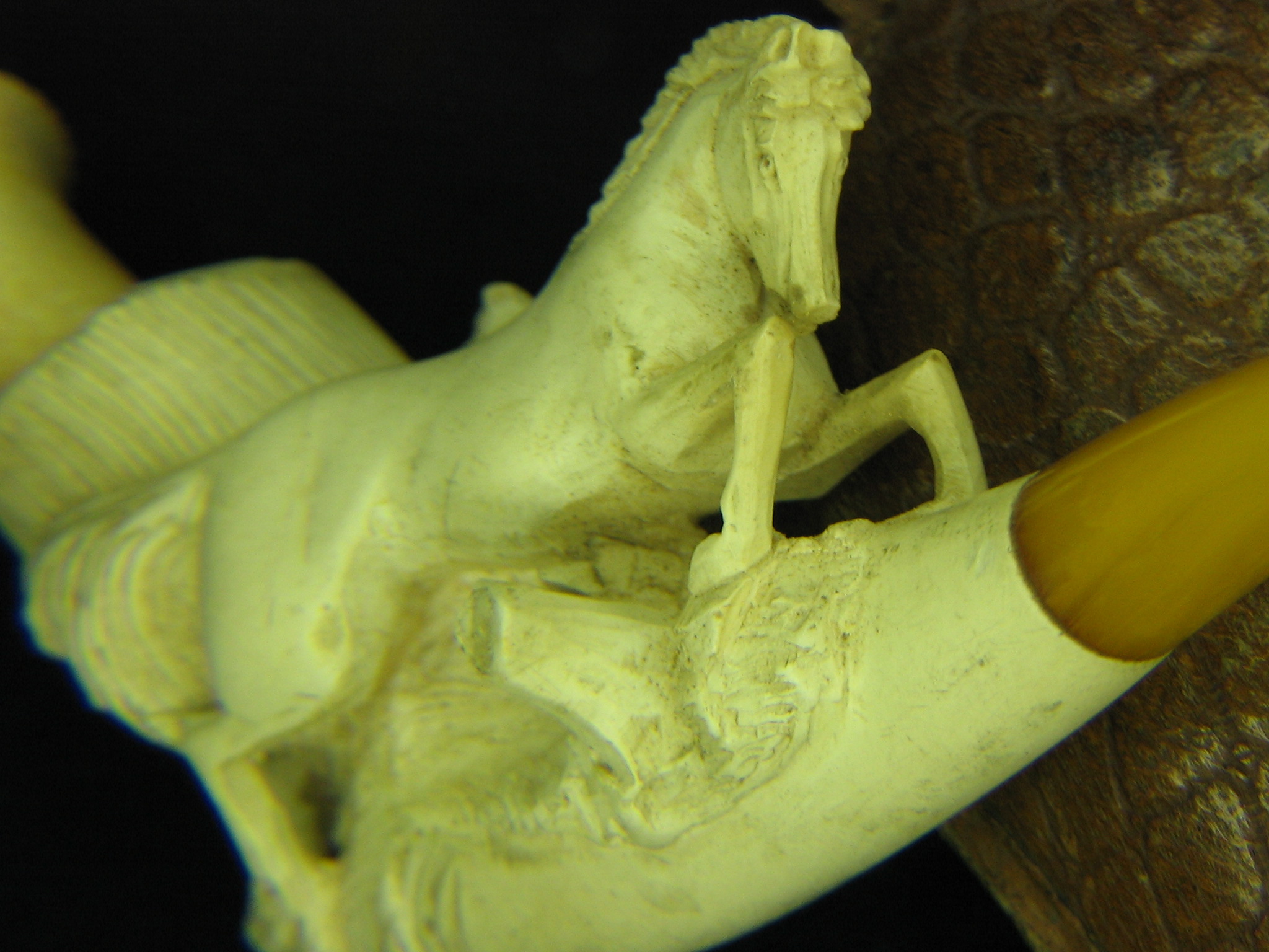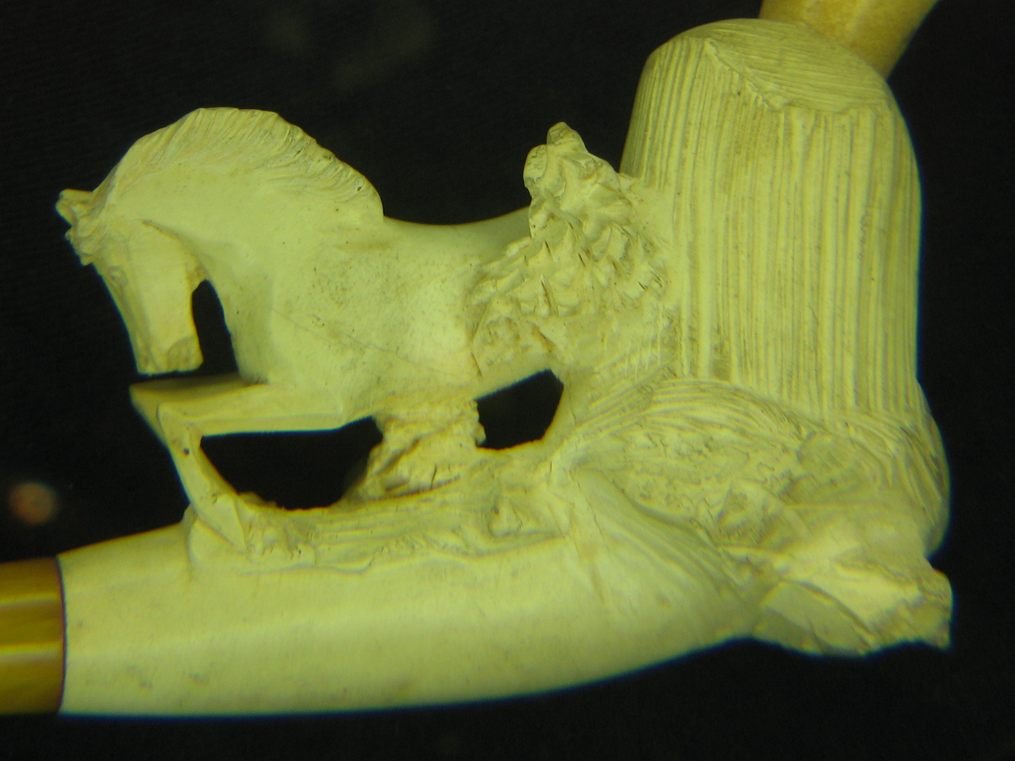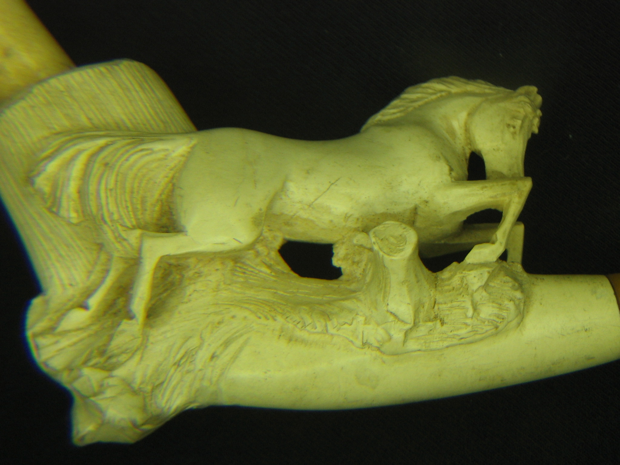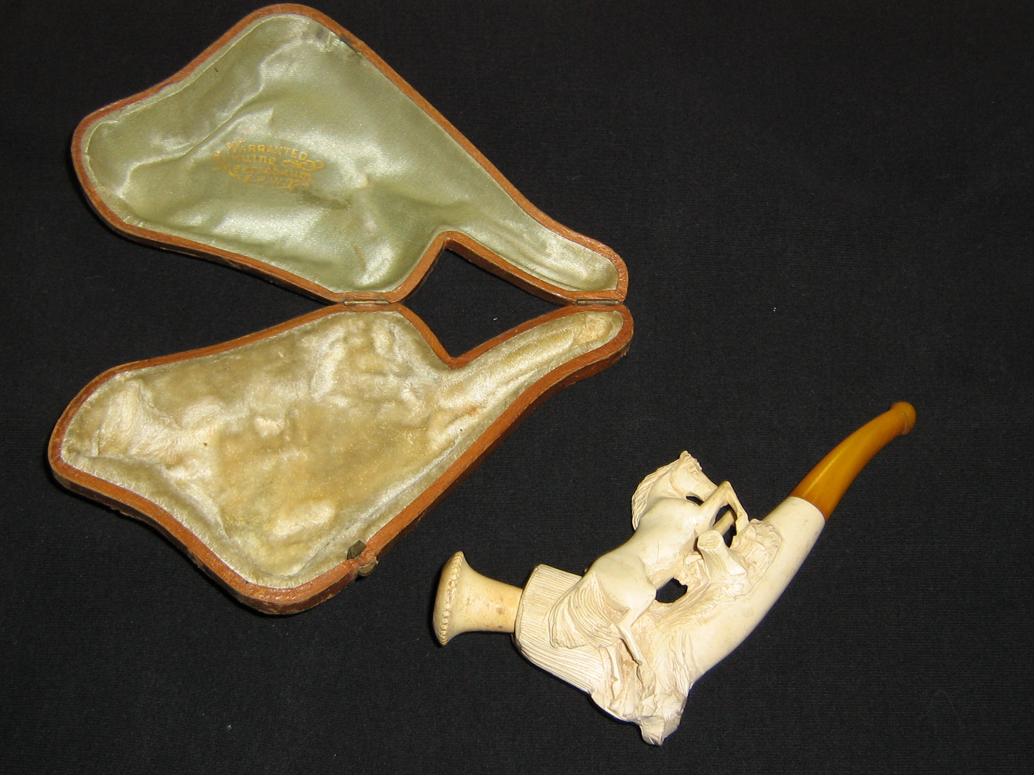 This pipe appears to be in good condition. I don't know much about these pipes but from what I can tell, it is in the original case and doesn't appear to have any damage. I did some searches of sold items on ebay but could not find this same pipe. There are similar ones that feature horses but the horse appears to be much smaller (this is the closest I could find: http://www.ebay.com/itm/Antique-19th-C-Carved-Horse-Meerschaum-Pipe-Cased-/260886297741?pt=UK_Collectables_Tobacciana_Smoking_LE&hash=item3cbe08fc8d).