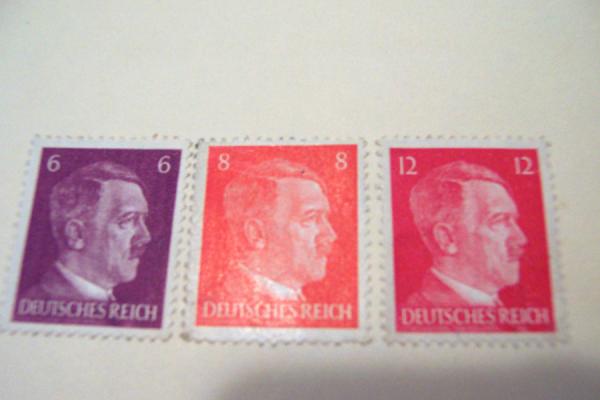 Three stamps on 1st (blank) page.Purple, Orange, and Red all of Hitler's profile