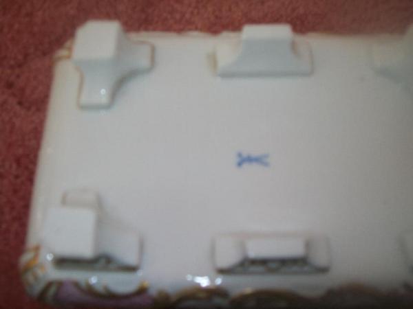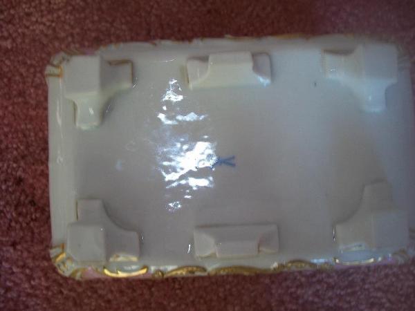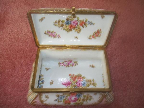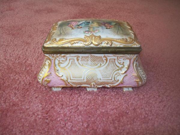 19th Century Meissen porcelain jewel box with courting couple and floral reserves, edged with relief moulded and gilded scroll leaves. 8"x5"x4.5"
