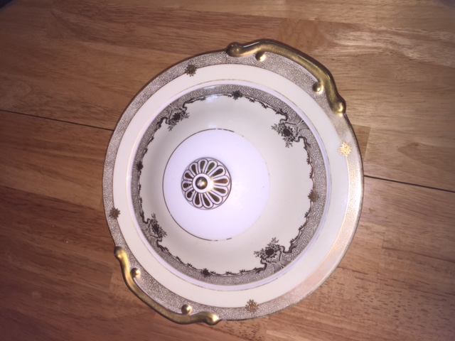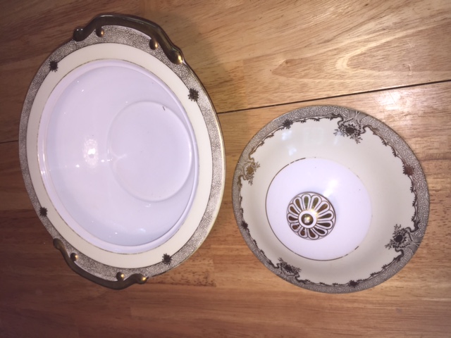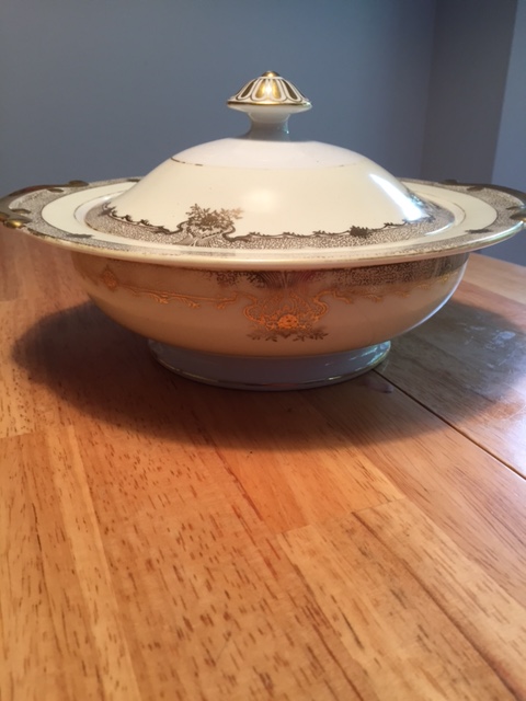 Gold trim Meito China Bowl and Lid looking for value and age.