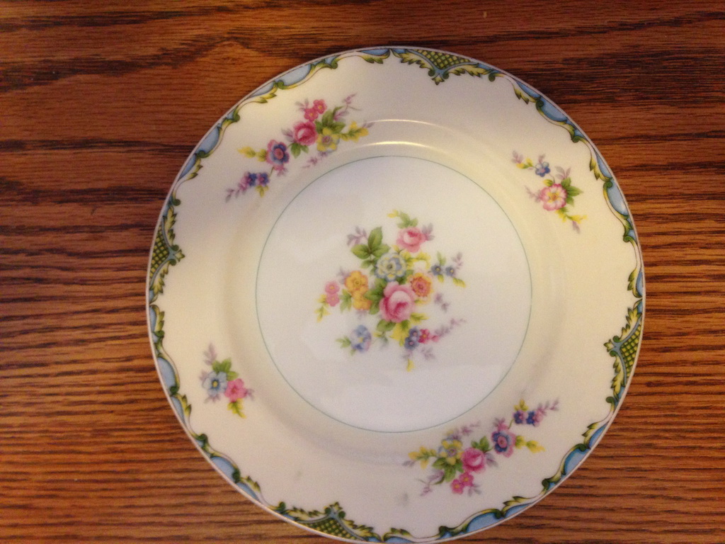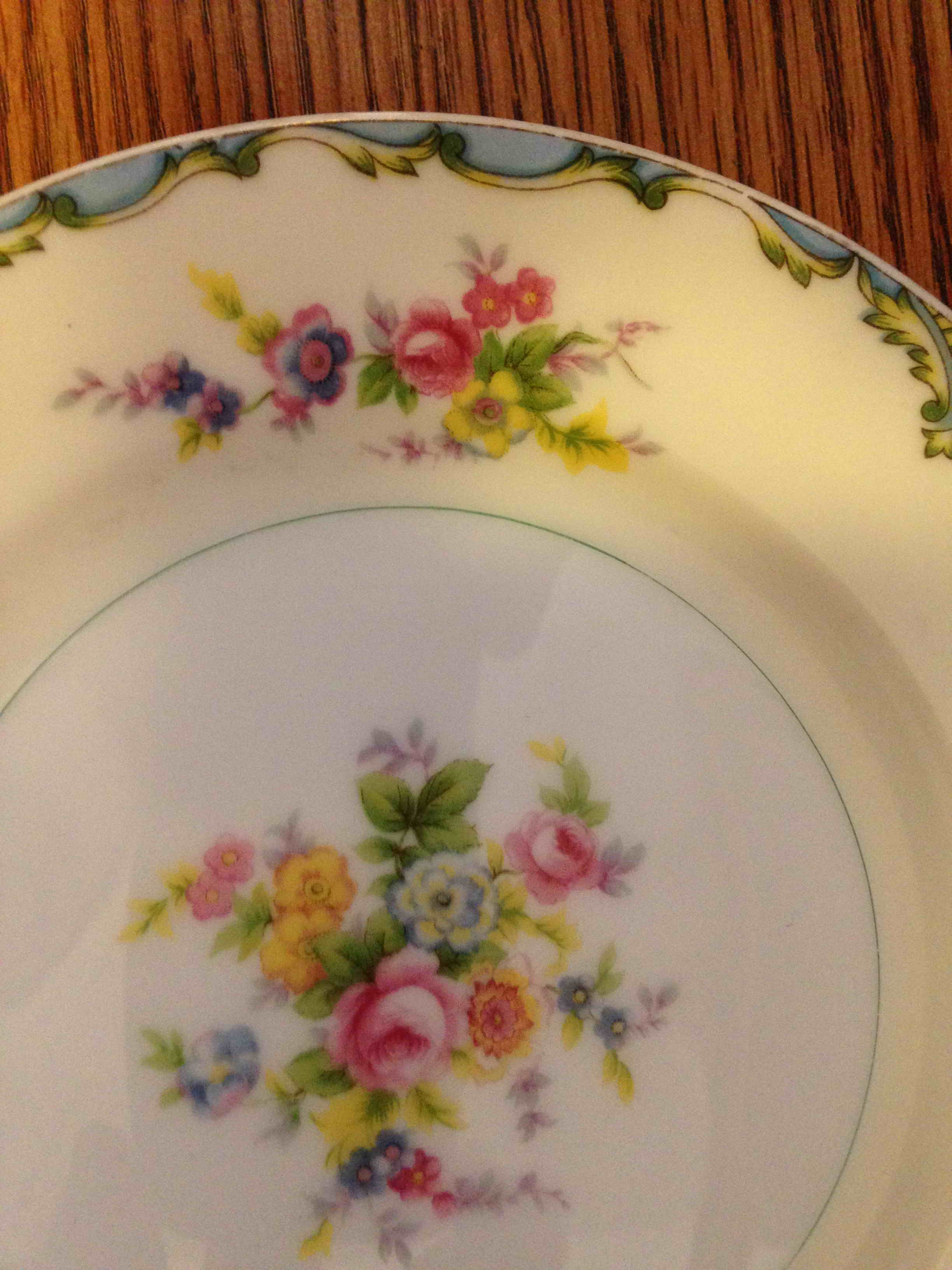 Mieto China ~ Made In Japan. Flower design - pink, yellow/w red etching on flowers, purple, & blue flowers w/greenery. Edges have criss-cross etched pattern with blue waves.