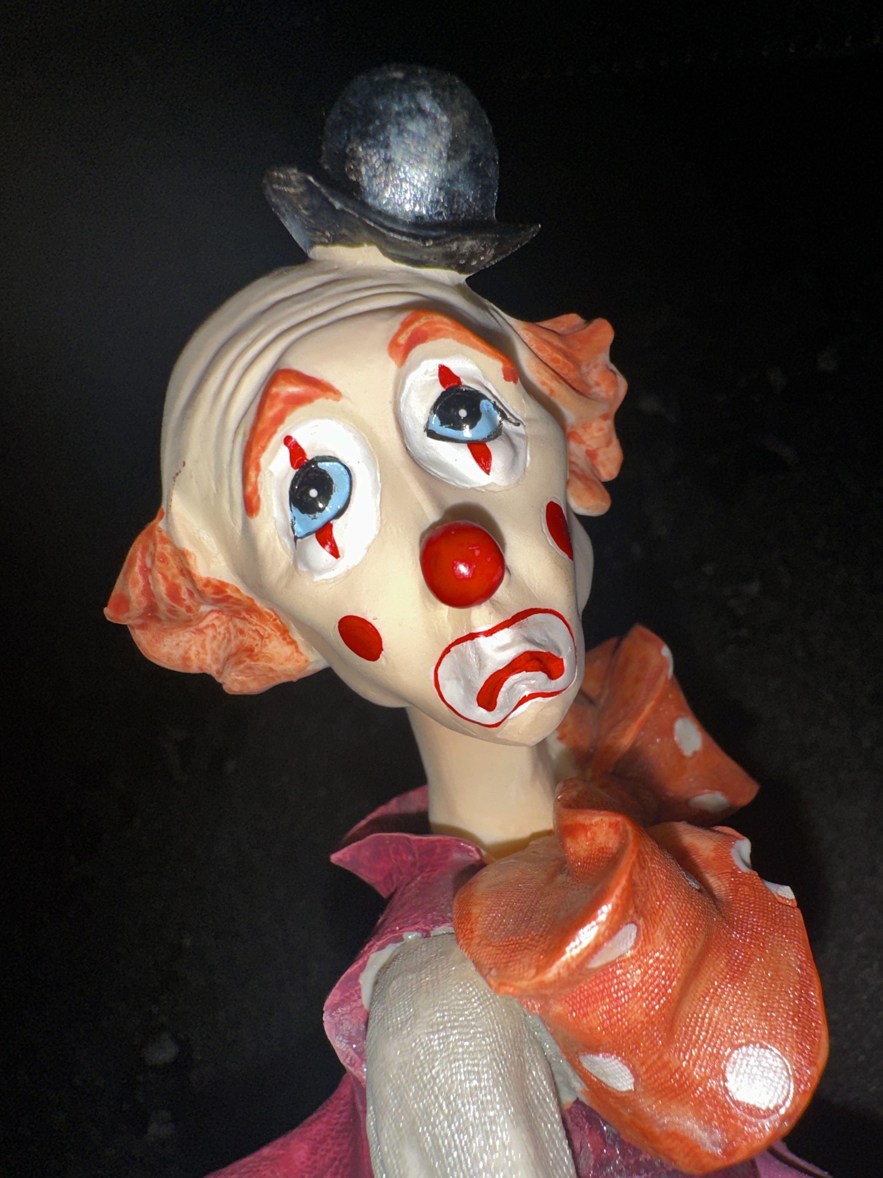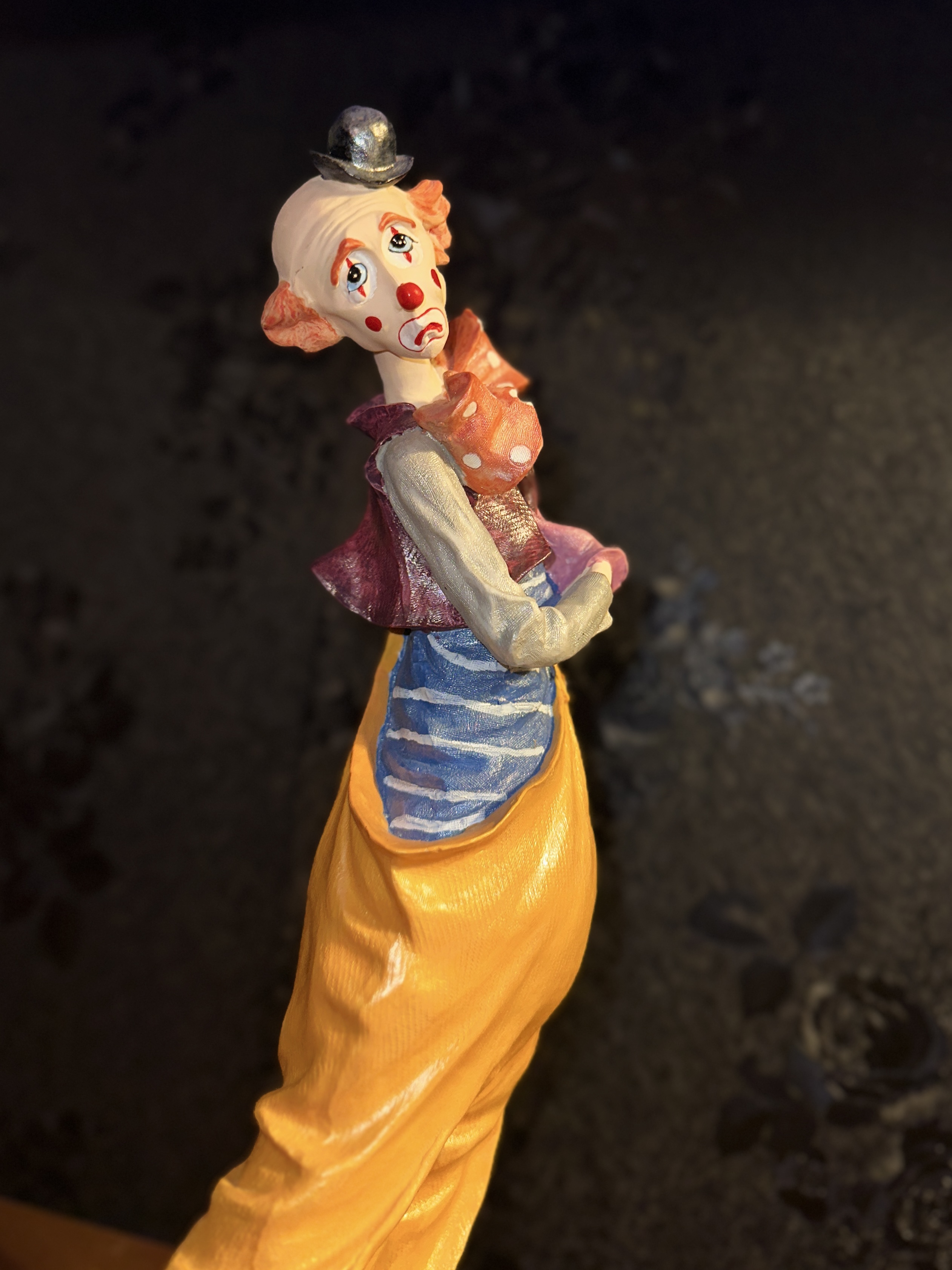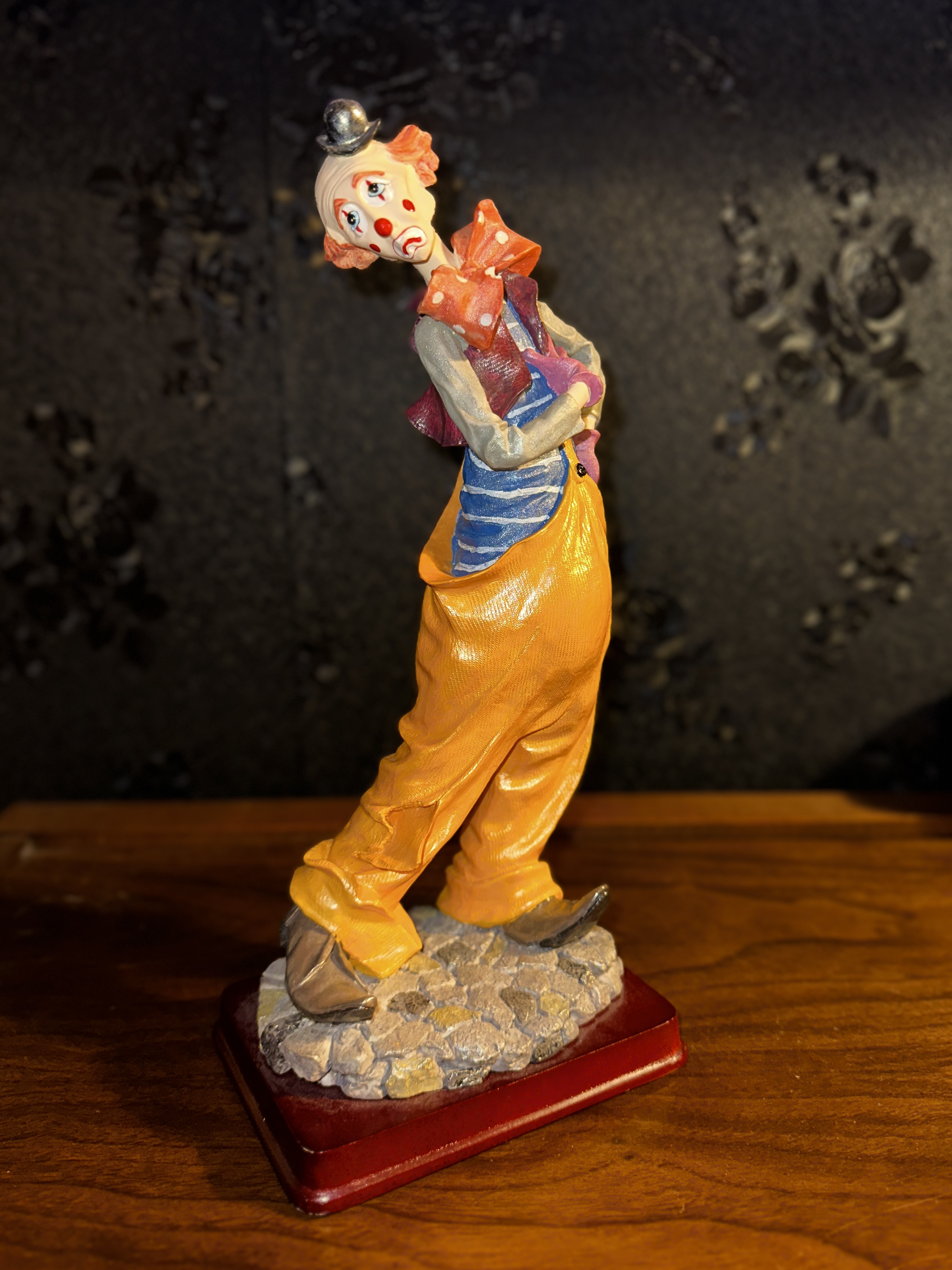 Melancholy Clown Figurine on Wood Base – Hand Painted Decorative Art Sculpture