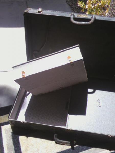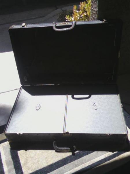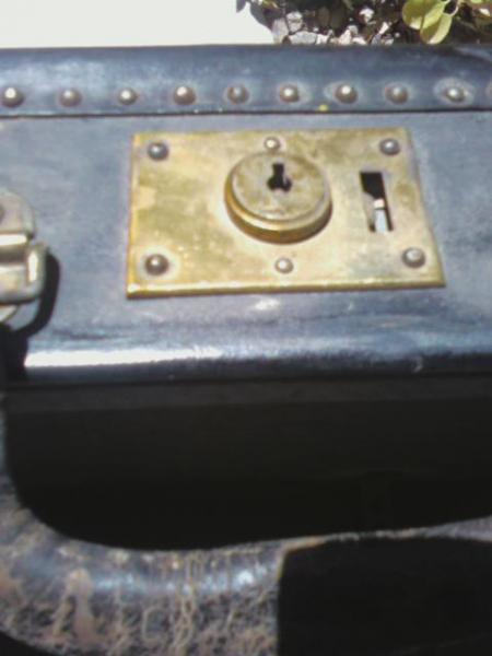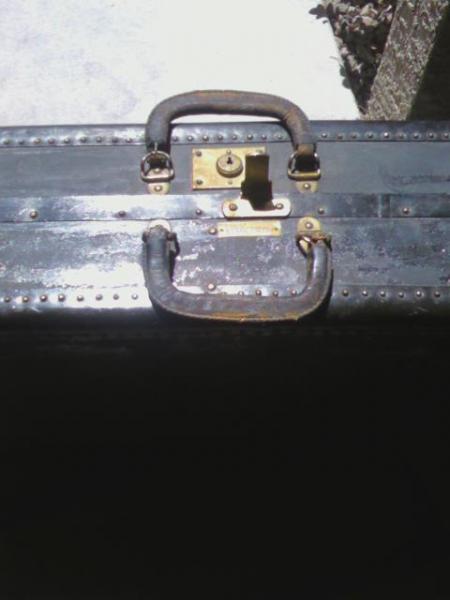 Black trunk looks like brass buttons, has locks stamped Eagle Lock Co, Terryville, CT. Inside are 2 luggage boxes with silver handles. It needs to be polished but is in good condition. No key for the lock. 2 leather handles