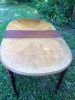 I inherited this table from my grandparents who have had this kithen table for over fifty years and bought it new. It has a few marks and scratches on the top and the chair material is somewhat worn. The chairs are orginal and have no rips. It comes with a leaf that has never been used.