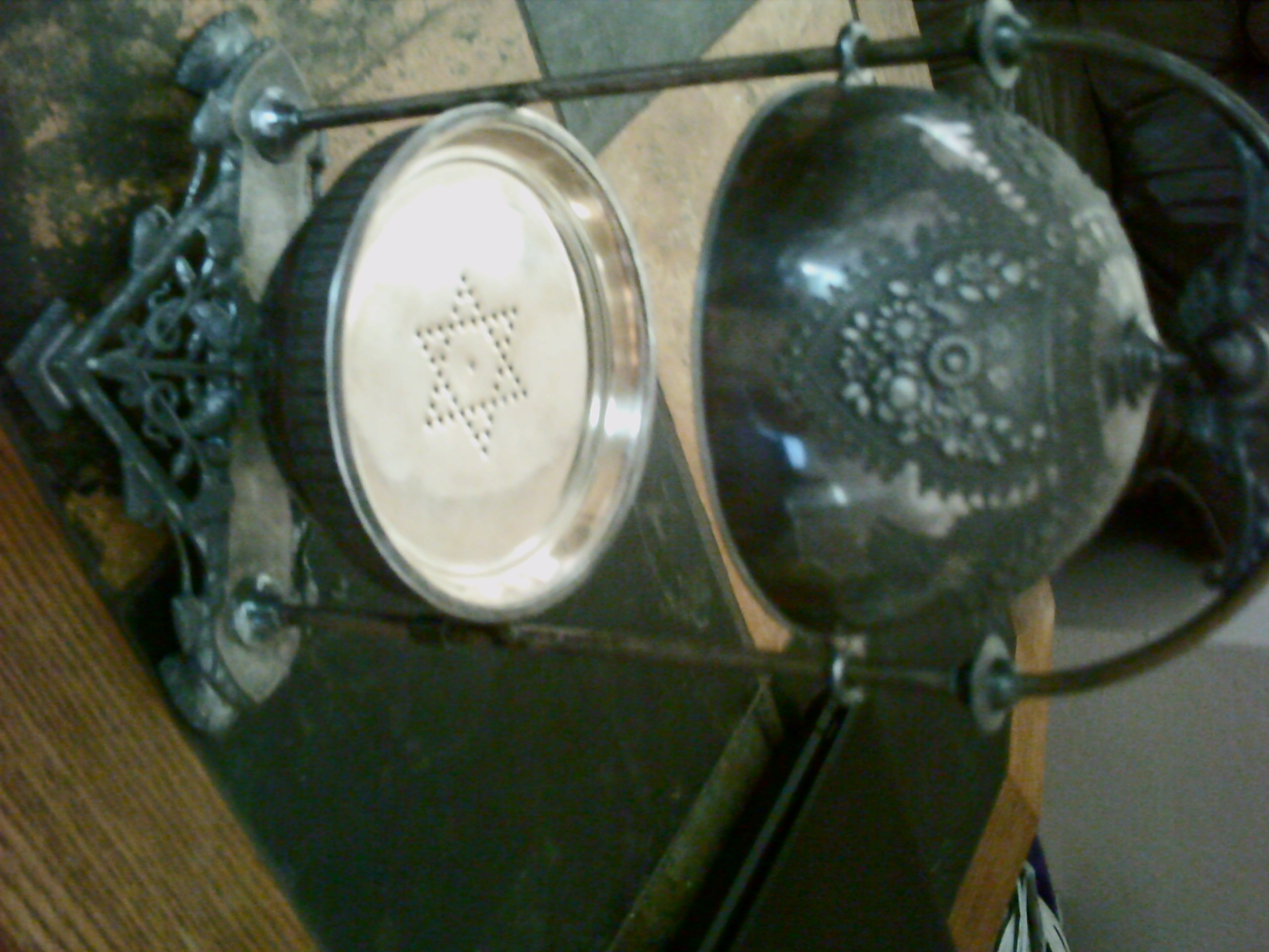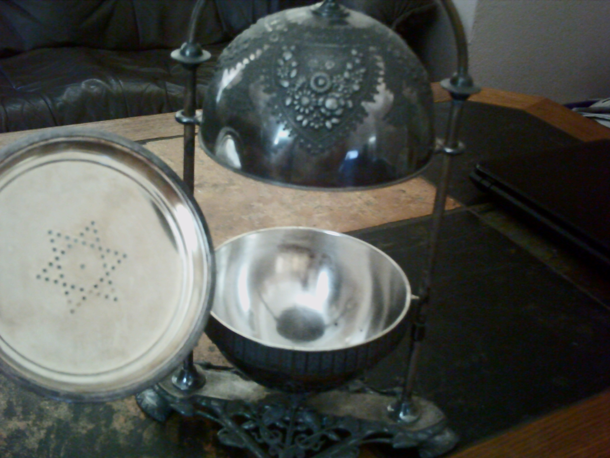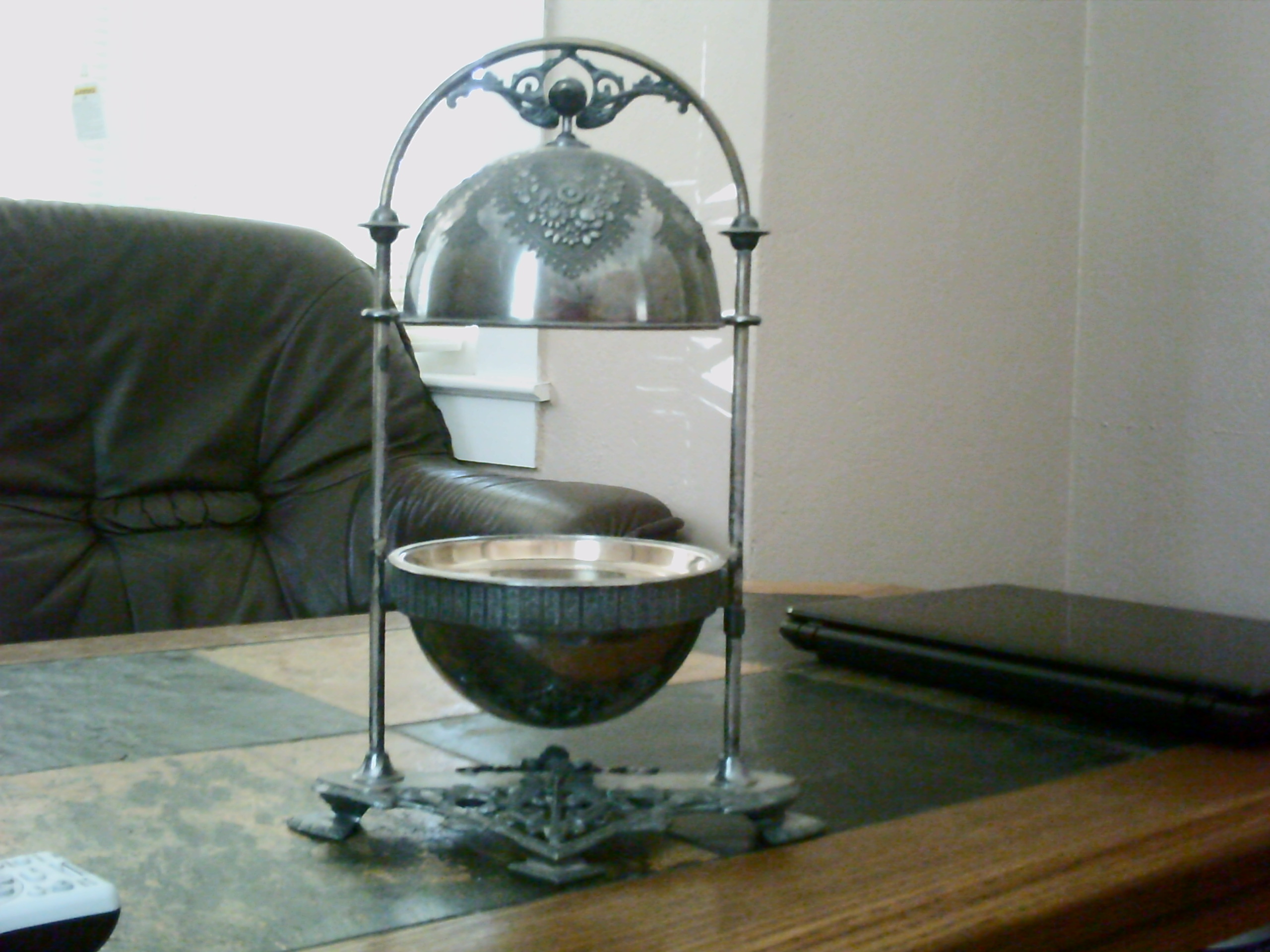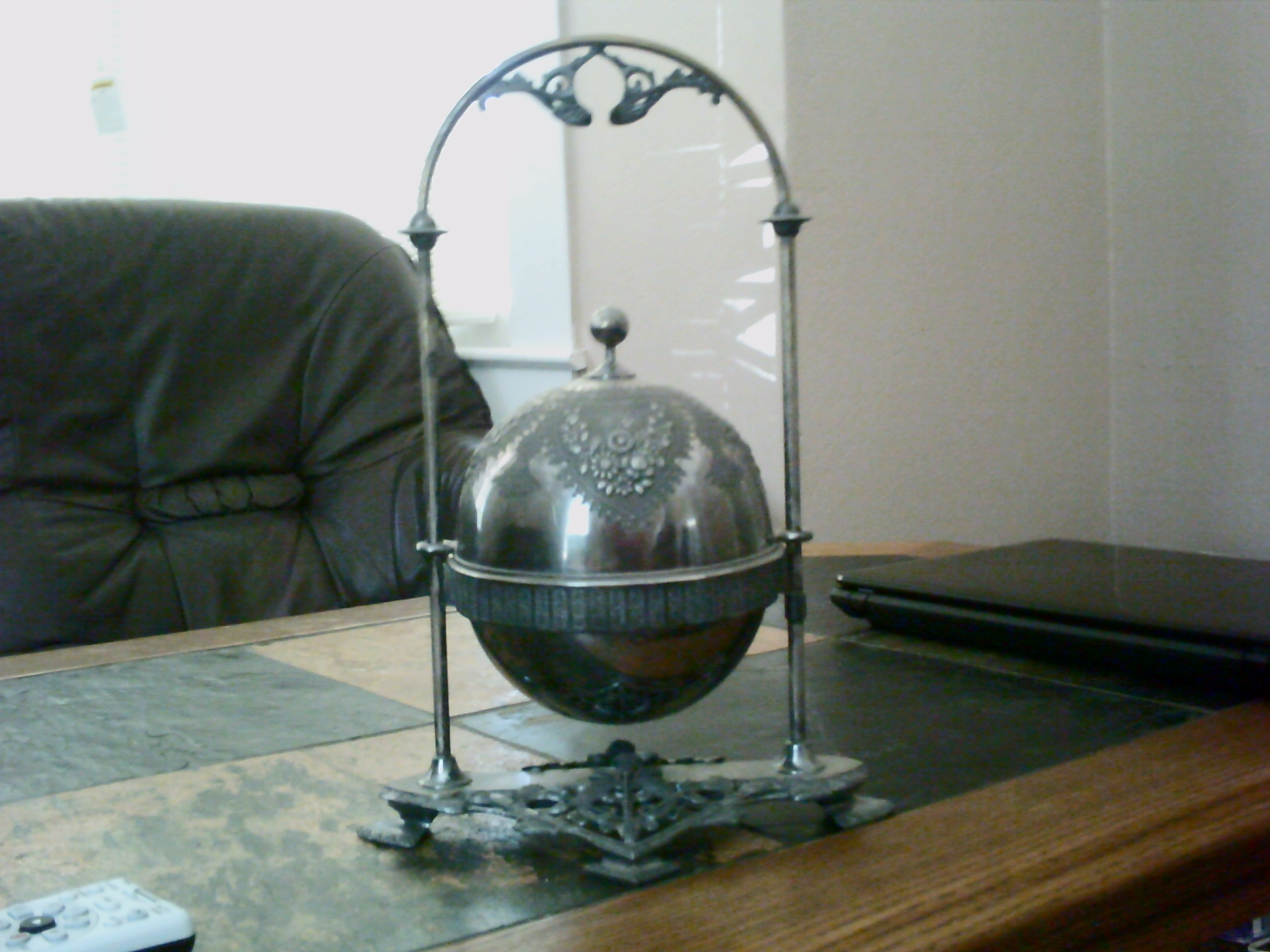 I'm pretty sure that this is made of silver, maybe black silver. It says Meridan B. Company 4398 July 14 1868 ingraved on the bottom of it. It has feet on the bottom and an arch from the bottom to the top. In the middle of it is a sphere, of three pieces. The top of the sphere comes up and hooks to a slot at the top of the arch. In the middle of the sphere is a removable tray with a star made of holes in it. It is very detailed with pictures and patterns.