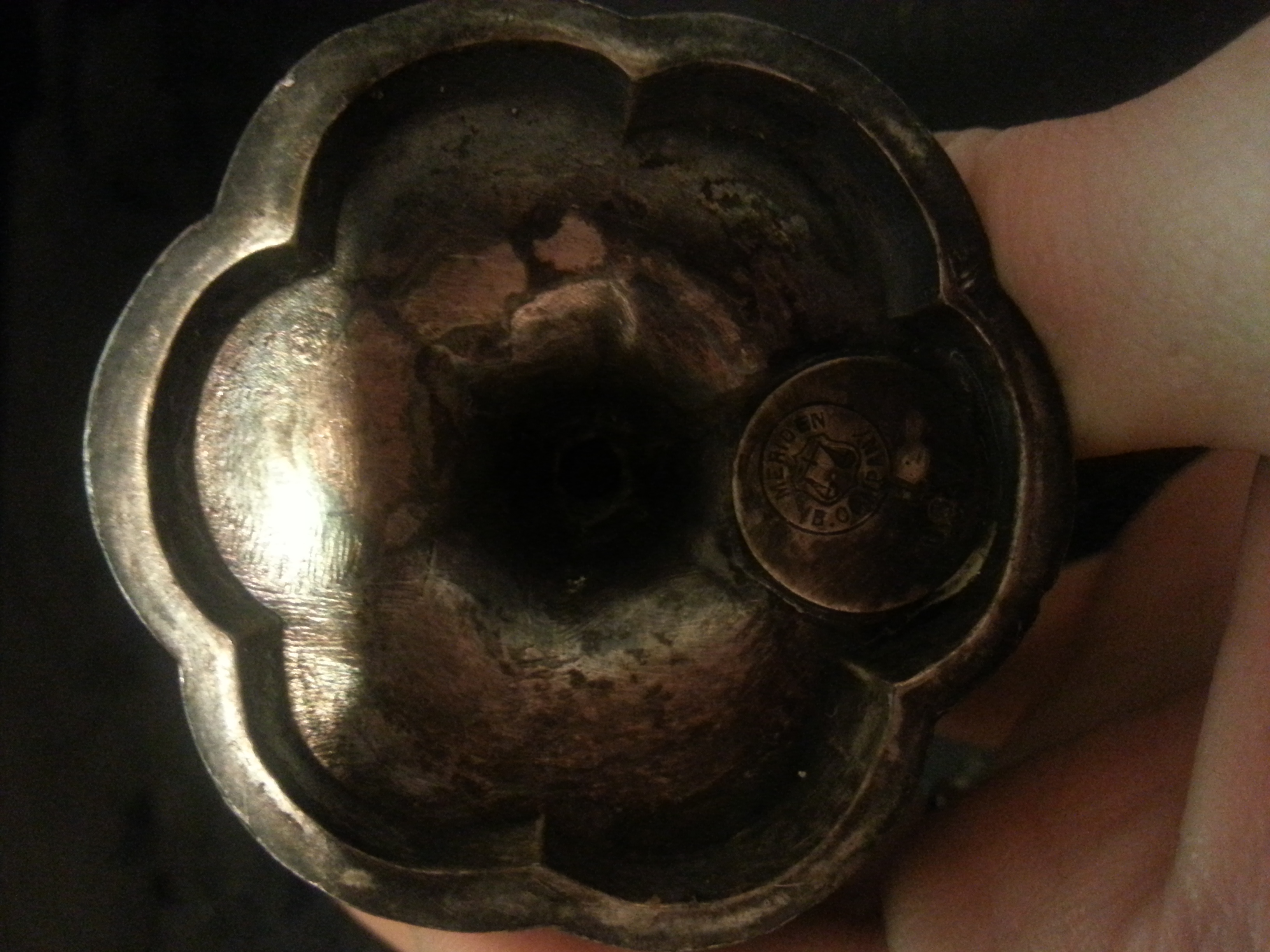 on the base,enderneeth , it says meriden b. company in a small circle. meriden is on top and b. co. is curving under with a scale inside the circle. under that there is a number 1 on it. and under that it says usa.
