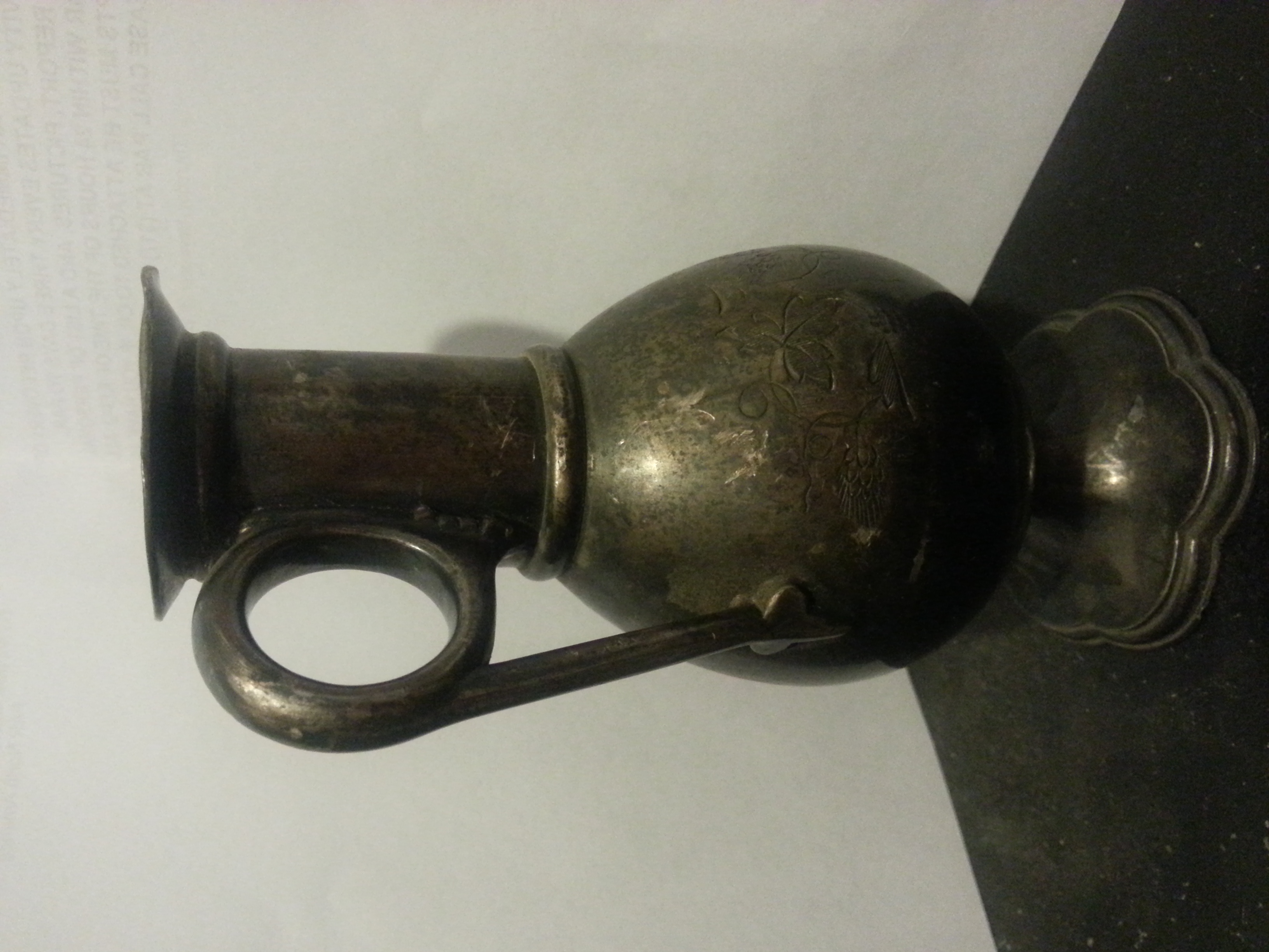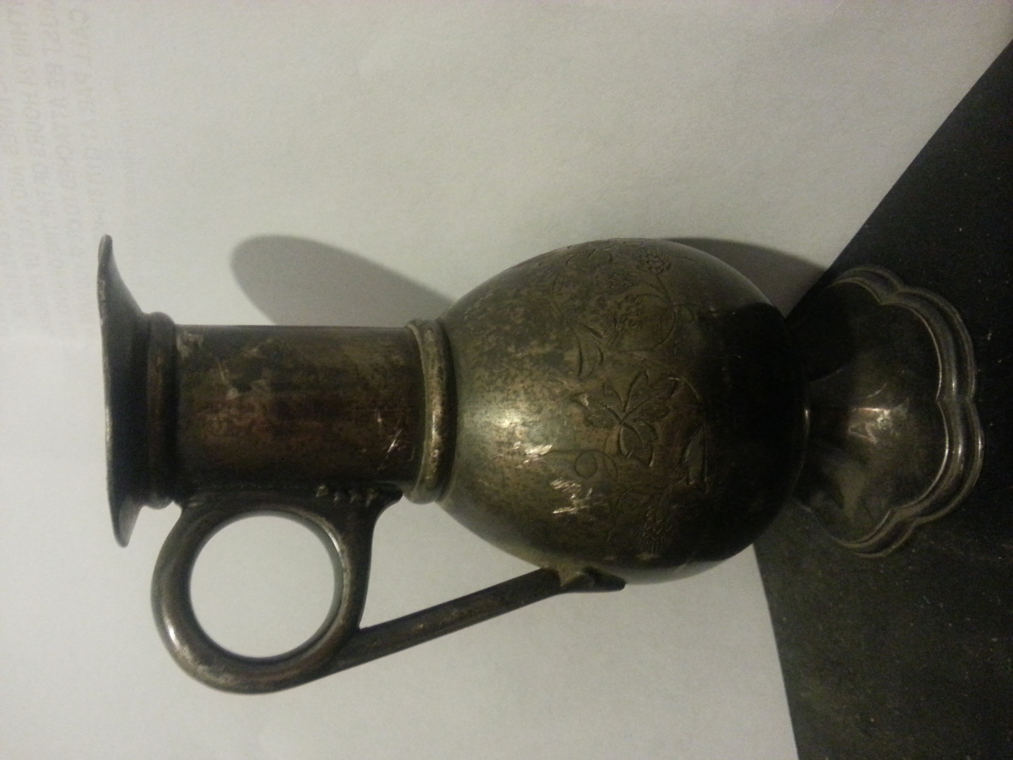 the neck of the vessel is about 2- inches high. and is not curved. straight up. there is a handle on it and the part you hold is completely straight up. not rounded out in an *ear*shape. it leads up to a circular ring.. simmilar to the design of a old fashoned baby diaper pin.....the bottom of the straight handle is connectd to the vessel bu a 3 pointed leaf...there is a wide brimmed lip arounf the top,like a spout...the front*pouring part* is wide and thick. about 1 inche wide and goes out about .5 inch.