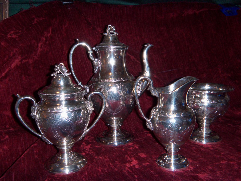 6 piece coffee/tea set made by Meriden B & Company. Included in the set are two teapots and 1 coffee pot with hinged lids. The handles have spacers to keep them from getting hot. There is also a covered sugar, creamer, and waste pot. All pieces feature grape bunches on lid, handle and spout. Also they have a highly embossed and detailed flower and are monogrammed. There are also embossed leaves around the rim of all pieces. All pieces are marked Meriden B & Company and have the logo of set of scales. They are also marked 1950, 1950 5, & 1950 6 (pattern number).