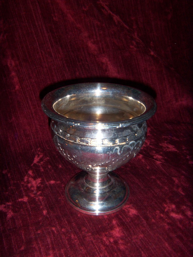 Set came with Serving Tray which seems to have same grape bunch pattern but is a 1930's or 1940's Federal Silver Company silverplate handled tray. It measures 15" in diameter (not including the ornate handles). This has a etched design at the center and an intricate border of grapes and grapevines. It's signed on the back "Federal Silver Co. Silver on Copper". This tray is in very good condition, there is absolutely no copper showing through the silverplate, This is a fine quality piece of silverplate hollowware, it's heavy and well-made.