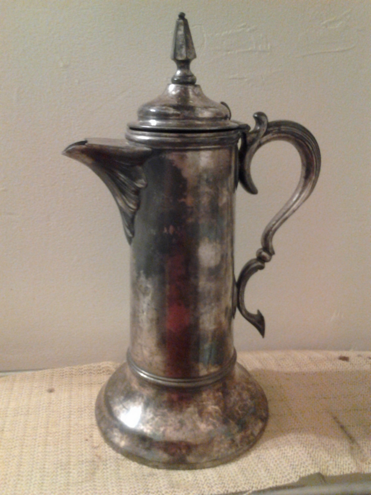 looks like a water pitcher, the body is smooth with no carvings. the top comes to a point. the handle curves and the bottom of the handle has a heart shape.the finish is very dirty looking, and looks like it has black smears all over. under the bottom theres a meriden b company stamp with the number 1390.can u tell me what year this was made and much its worth?