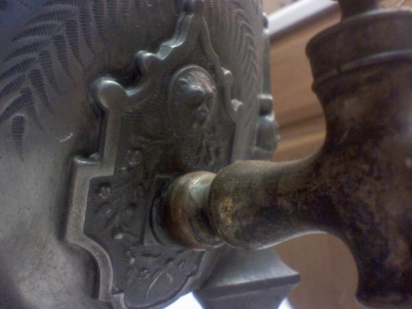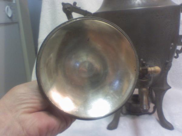 Meriden B Company Samovar. Says Patent Applied For on bottom. Artwork includes ferns, flowers, lions heads and clawed feet. Bone handle on lid and spout.