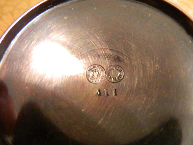THE BOTTOM IS MARKED MERIDEN B. COMPANY, SURROUNDING SCALES. NEXT TO IT IS QUADRUPLE PLATE, AND UNDERNEATH HAS THE NUMBER 411. AT THE TOP OF THE GOBLET HAS AN OLD ENGLISH "C" MONOGRAM. THERE IS EMBOSSED ORNATE FILIGREE. THE GOBLET IS IN GOOD CONDITION AND WEIGHS 9.5 OZ. THE PATINA IS NICE BUT WOULD SHINE UP REALLY GOOD.